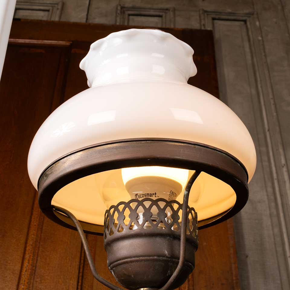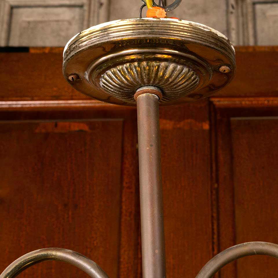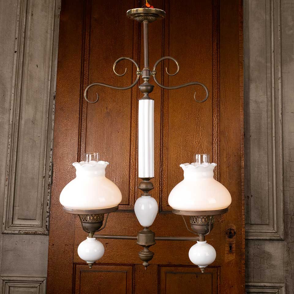 Architectural salvage antique brass and milk glass electrified two bulb oil lamp chandelier light fixture measuring approx. 21 3/4" wide x 33" tall x 7 1/2" front to back. There's a crack at the base of the fluted milk glass piece. See photos to evaluate condition. Salvaged lighting should be inspected by a licensed electrician prior to installation.