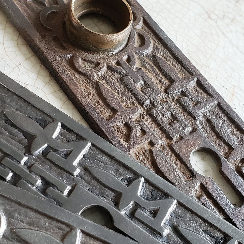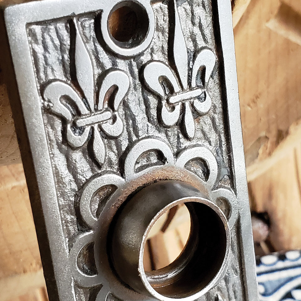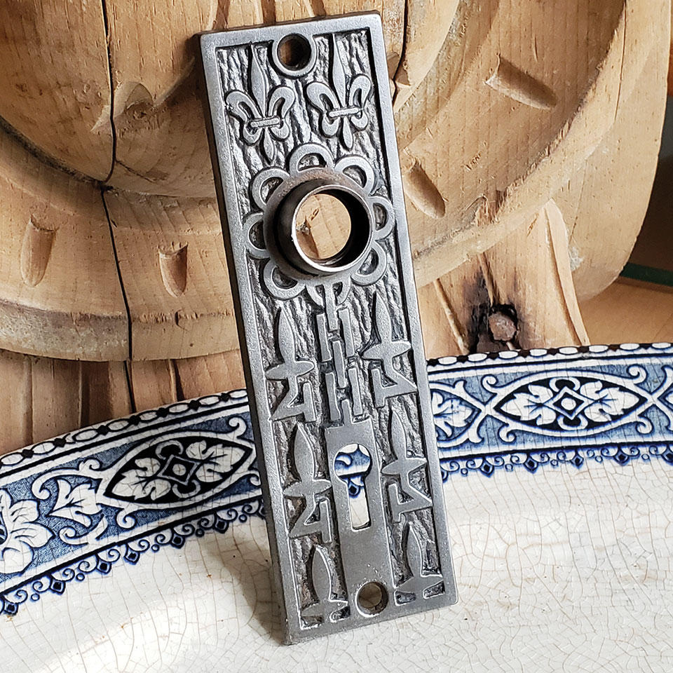 Antique architectural salvage ornate cast iron Mallory Wheeler Co. Fleur-de-lis pattern doorknob backplate hardware approx. (1 5/8" wide x 5 1/4" tall x 1/2" thick). Color and condition vary, see photos to evaluate. Priced at $28/each.