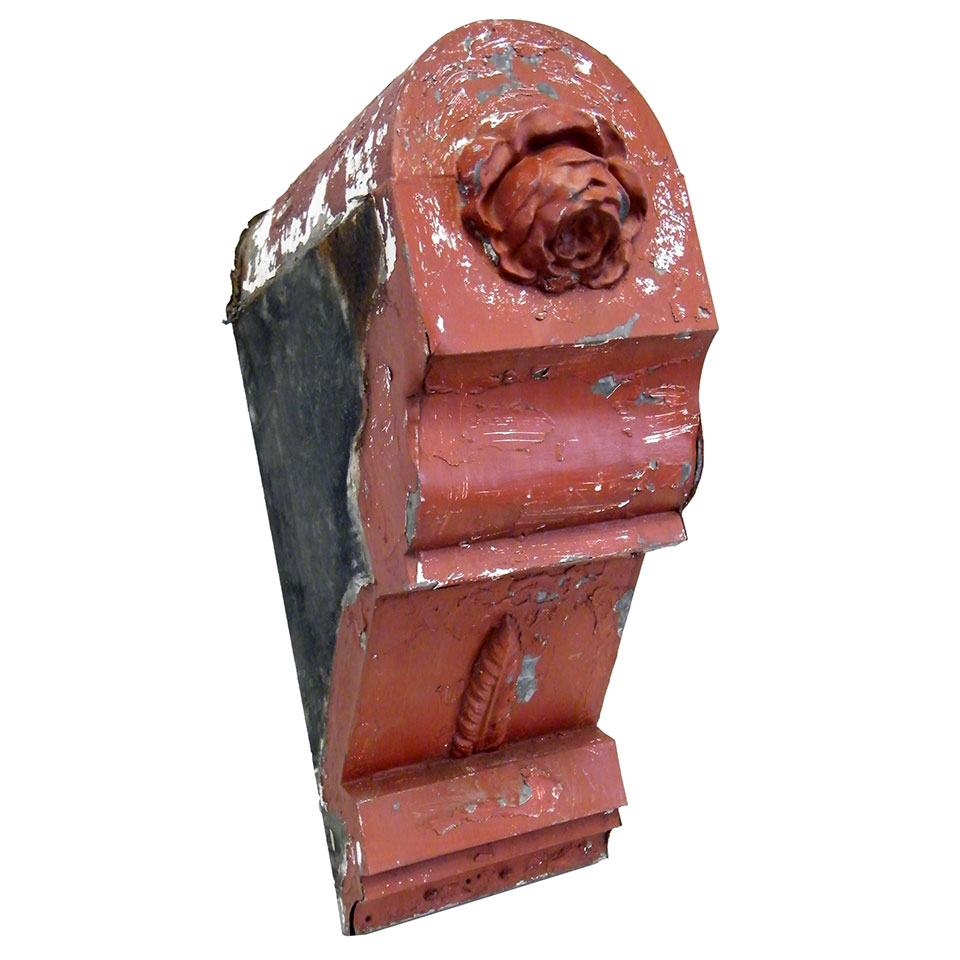 Vintage/antique architectural salvage metal building cornice corbel with floral motif. This piece measures approximately 9 3/4" wide x 24" tall with a 14 1/2" projection.