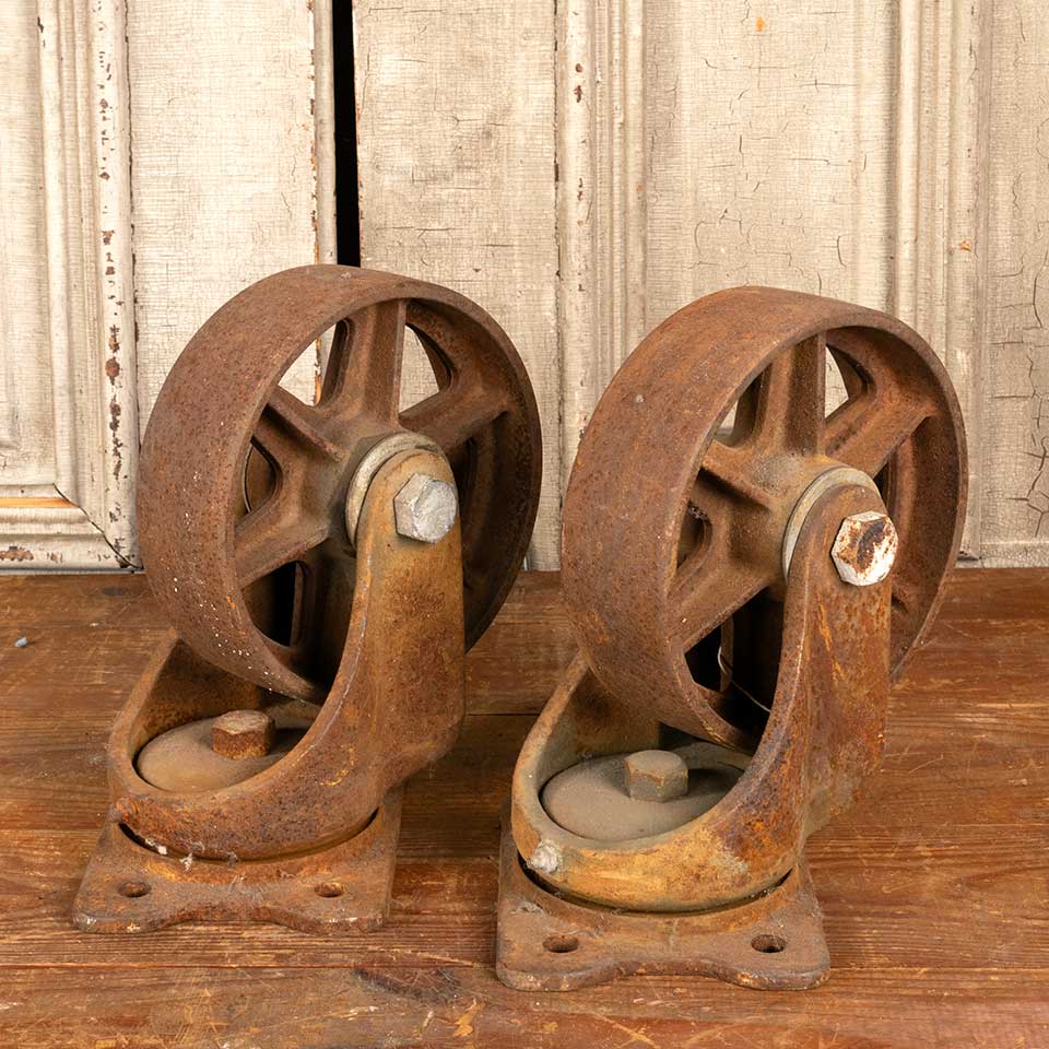 Pair of salvaged antique cast iron industrial factory cart caster wheels each measuring approx. 5 7/16" wide x 10 1/8" tall x 10 1/4" thick. See photos to evaluate condition. Priced at $178 for the pair.