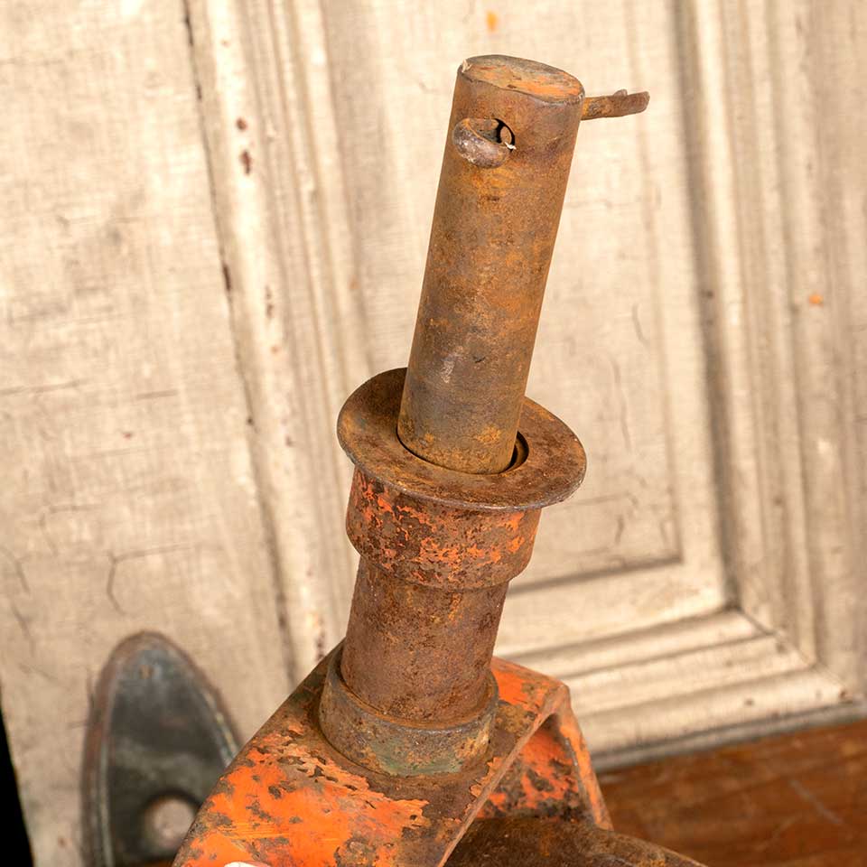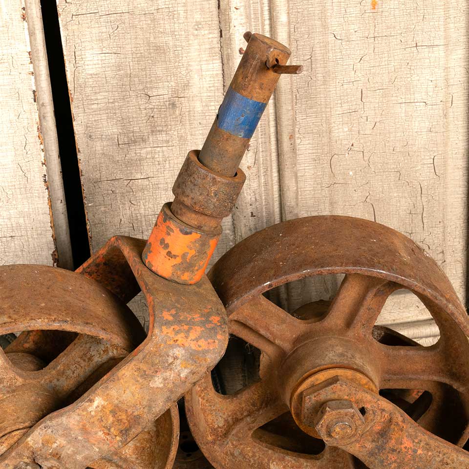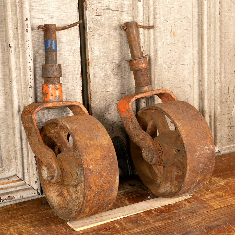 Pair of salvaged antique cast iron industrial factory cart caster wheels each measuring approx. 5" wide x 15 1/2" tall x 8" thick. See photos to evaluate condition. Priced at $135 for the pair.