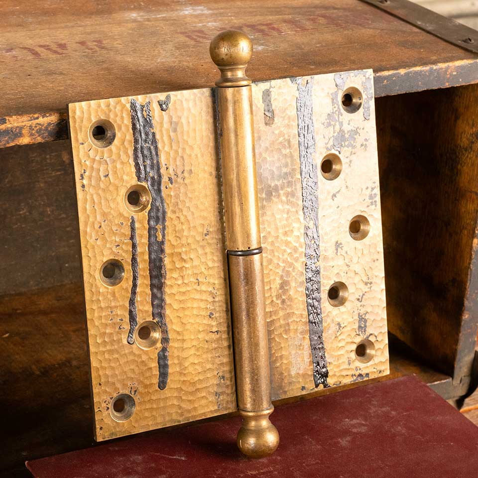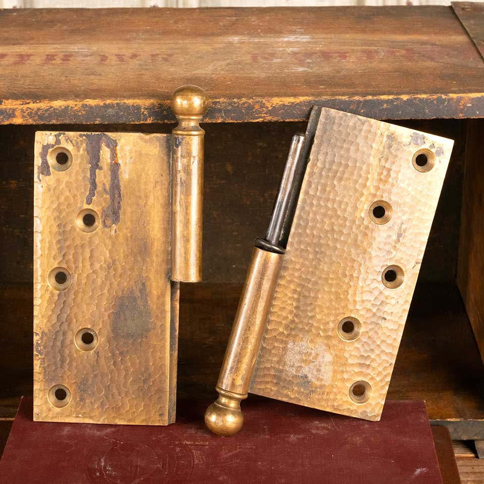 Antique architectural salvage large hammered solid brass ball finial lift off door hinge hardware (right hand swing) each measuring approx. 6 1/8" wide x 5 7/8" tall (7 3/4 tall including finials). Color and condition vary, see photos to evaluate. Priced at $95/each.
