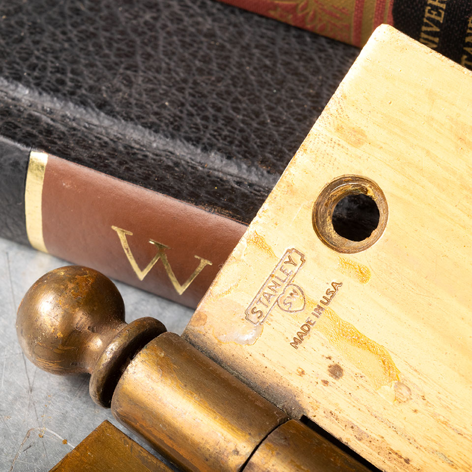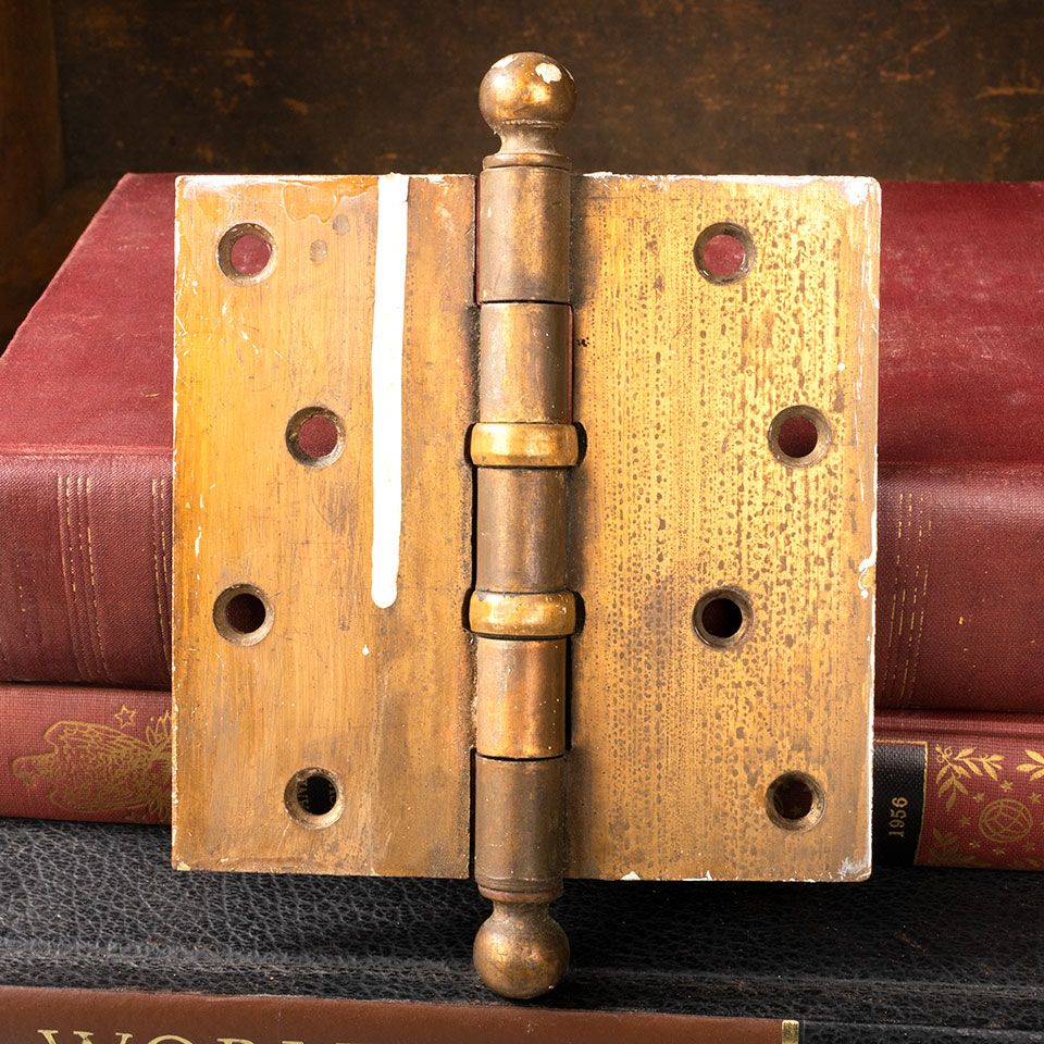 Antique architectural salvage heavy duty brass plated steel ball bearing ball finial Stanley SW Sweetheart door hinge hardware measuring approx. 4 1/2" square (6" tall including finials). Made in USA. Color and condition vary, see photos to evaluate. Priced at $14/each.