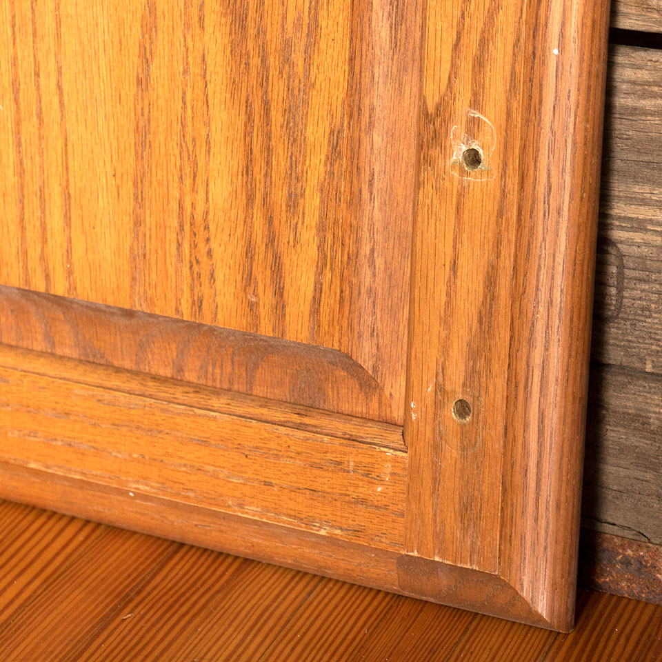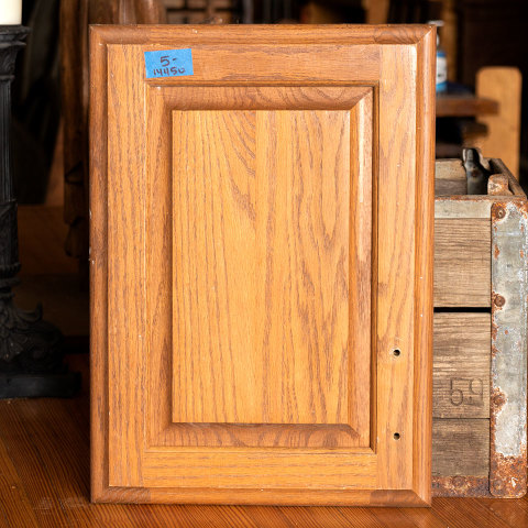 Salvaged oak cabinet door measuring approximately 12 1/2" wide x 17 1/2" tall x 7/8" thick. Due to the nature of architectural salvage - condition and color may vary. Priced at $5/each.