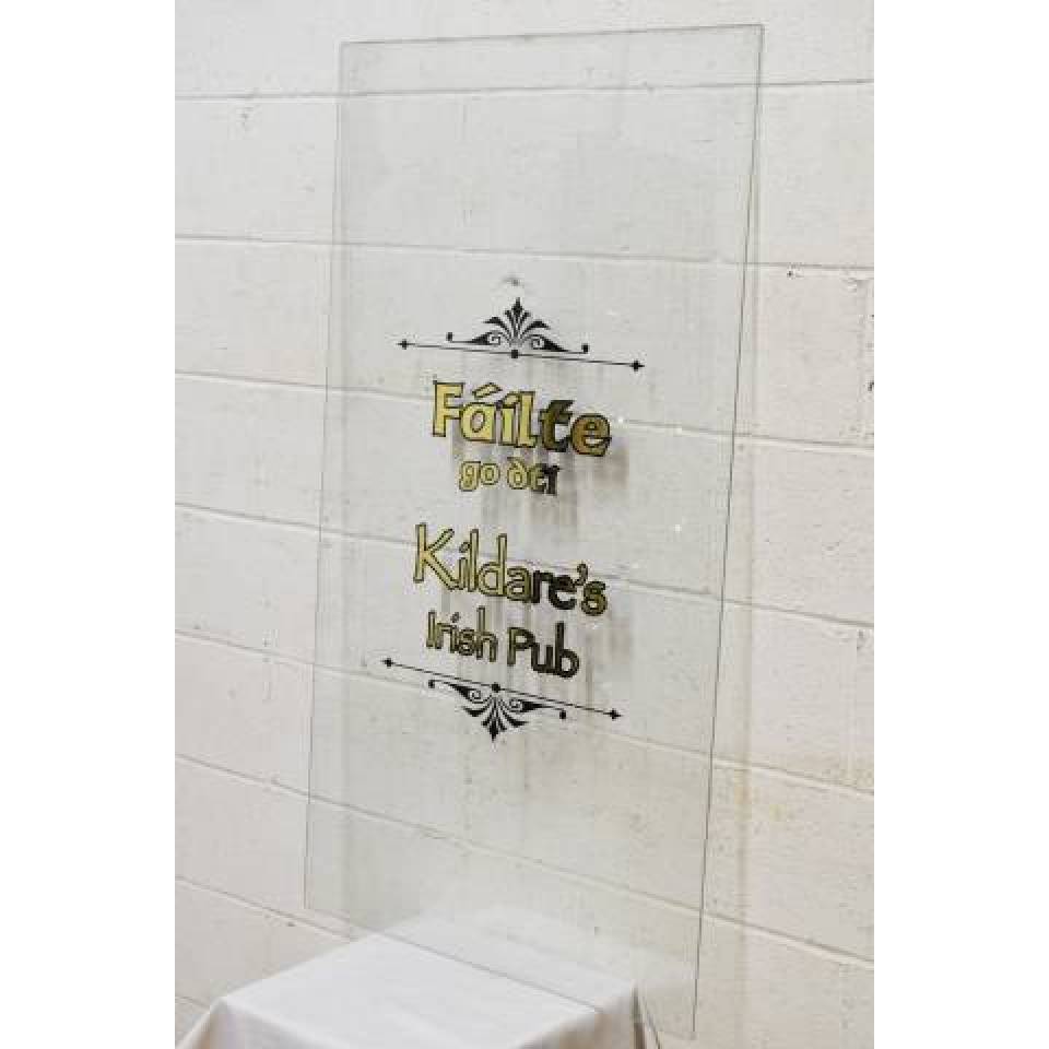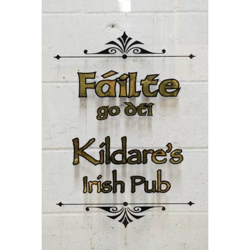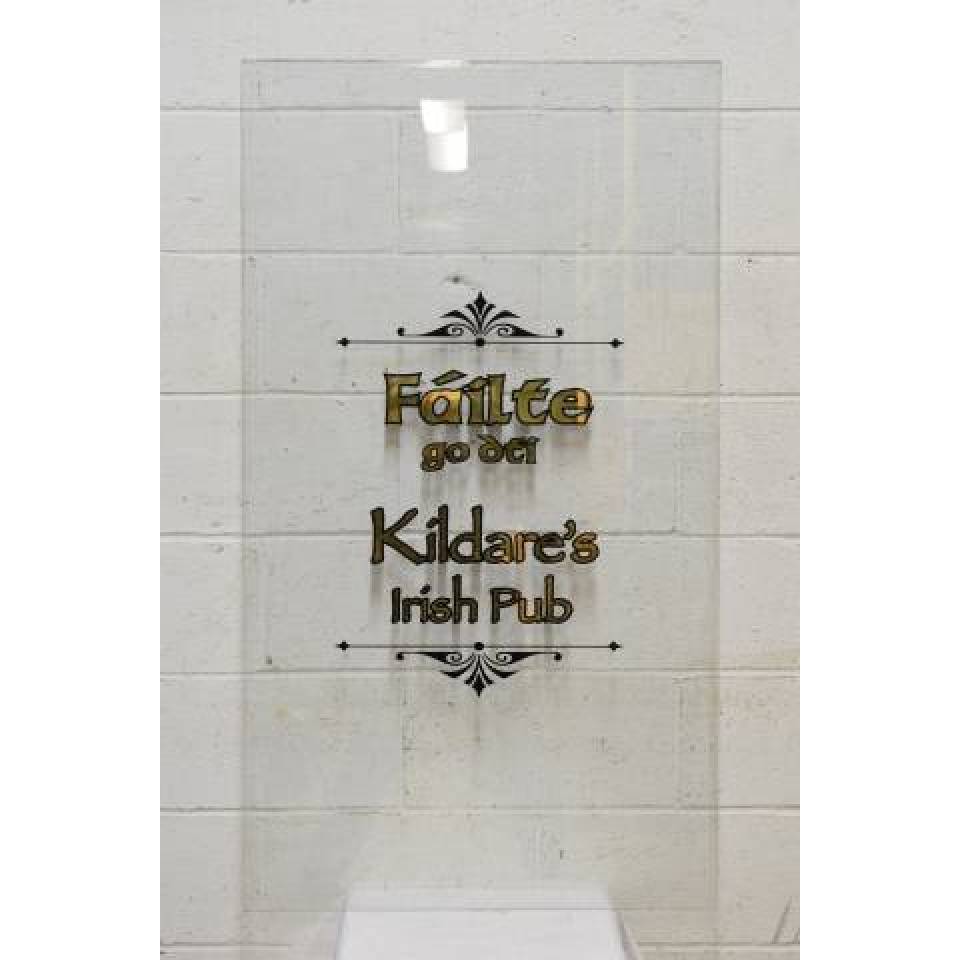Architectural salvage glass window pane from Kildare's Irish Pub with gold lettering measuring approximately 26 3/4" wide x 47 3/4" tall. Lettering translates to "Welcome to Kildare's Irish Pub".