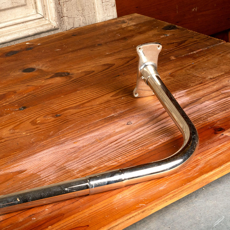 Architectural salvage chrome shower curtain / drapery rod measuring approx. 1" in diameter x 50 1/4" long x 12" front to back and brackets each measuring approx. 2" x 4 1/2". Each turned end can be adjusted or removed from the main bar. See photos to evaluate condition.