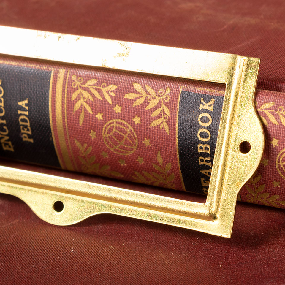 Brass card catalog apothecary description label holder hardware measuring approximately 3 1/2" x 1 3/4" overall. Sold individually. Priced at $4/each. Used item. Condition may vary.