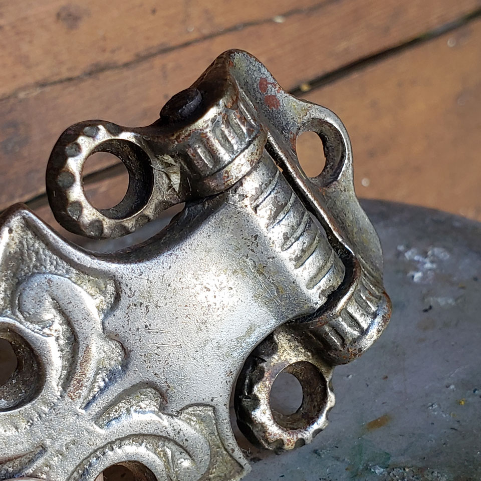 Antique architectural salvage nickel plated brass wood ice box cabinet door hinge hardware measuring approximately 2" x 3 1/8".