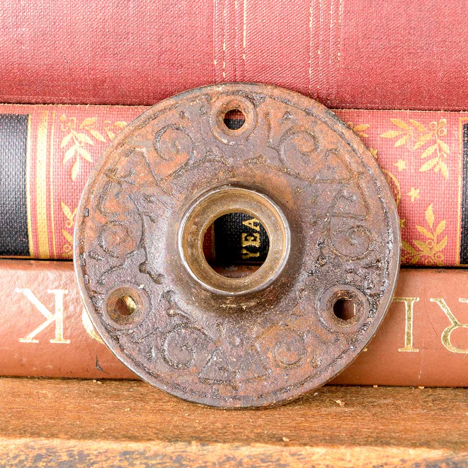 Architectural salvage antique ornate cast iron doorknob rosette door hardware measuring approx. 2 1/8" in diameter with a 11/16" diameter collar. See photos to evaluate condition.