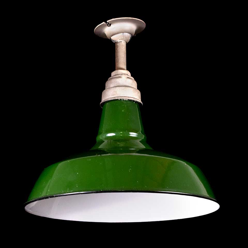 Vintage antique architectural salvage green porcelain enameled industrial farmhouse pendant light fixture measuring approximately 14" diameter. Priced at $148/each. Due to the nature of architectural salvage - condition and fittings may vary.