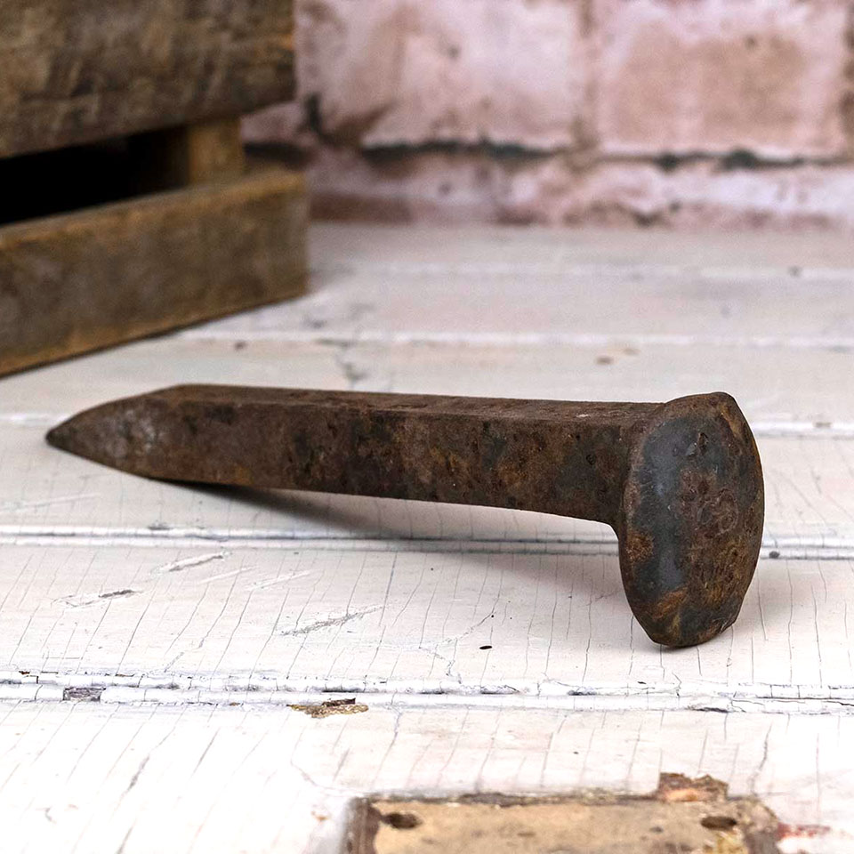 Old antique rusty iron railroad spike measuring approximately 1 3/8" x 6 3/4" x 1 5/8". Sold individually. Priced at $8/each. Condition may vary.