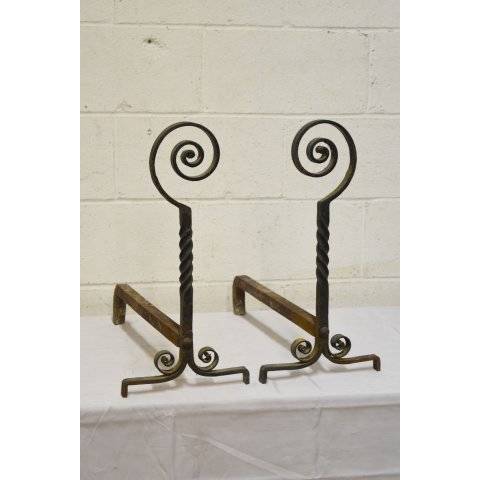 Great looking pair of antique architectural salvage wrought iron fireplace andirons each measuring approx. 9 1/2" wide x 19 1/2" tall x 19 1/2" front to back. Priced at $175 for the pair.