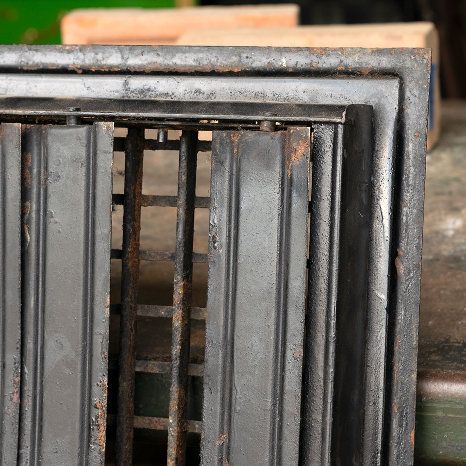 Vintage antique architectural salvage pressed metal floor heat grate register grille measuring approximately 12" x 14" (insert dimensions) and 14" x 16" (overall dimensions). One louver is missing. See photos to evaluate condition.