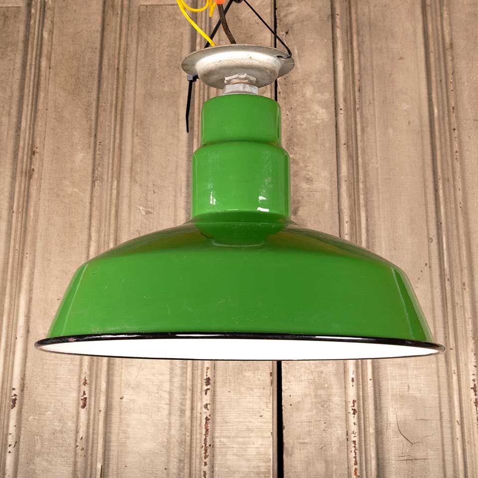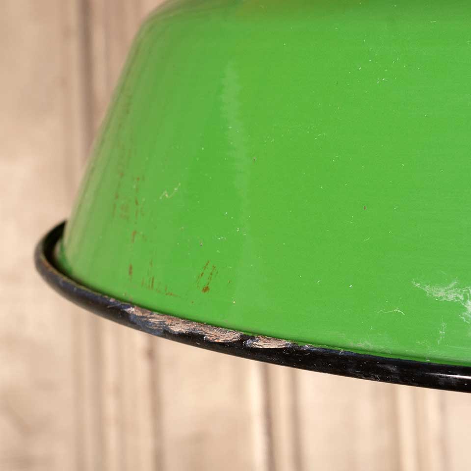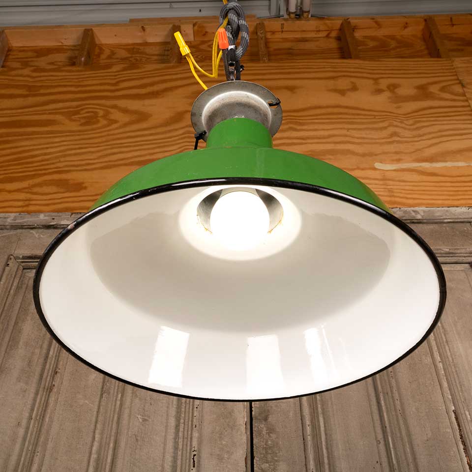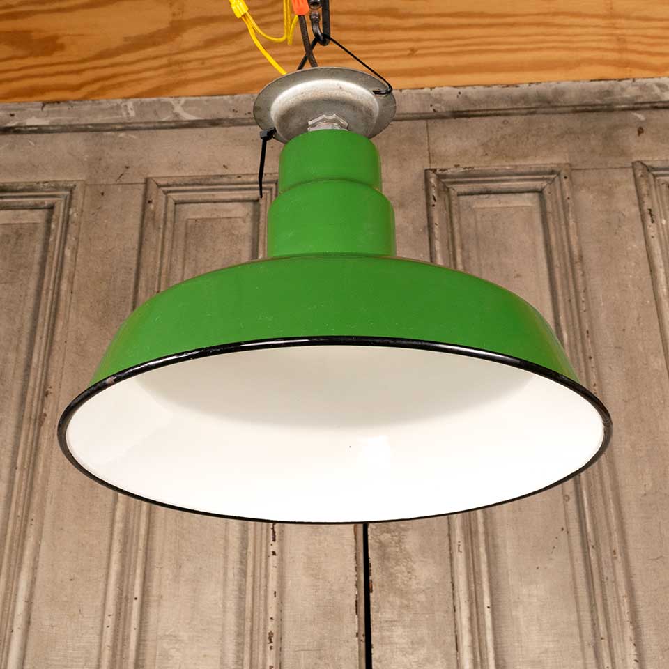 Architectural salvage antique green and white porcelain enameled metal industrial flush mount light fixture measuring approx. 14 3/8" in diameter x 10 1/2" tall. See photos to evaluate condition. Salvaged lighting should be inspected by a licensed electrician prior to installation.