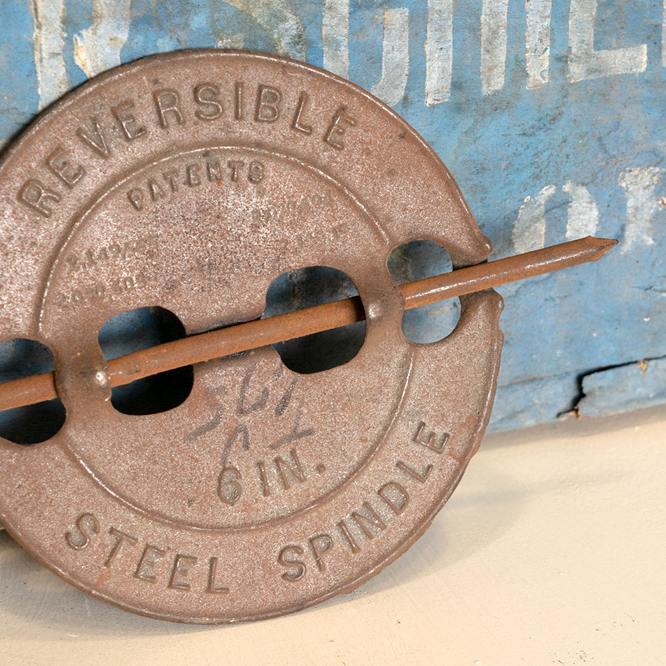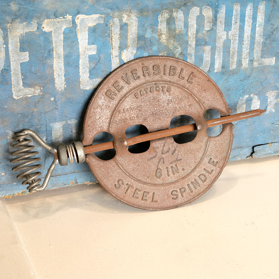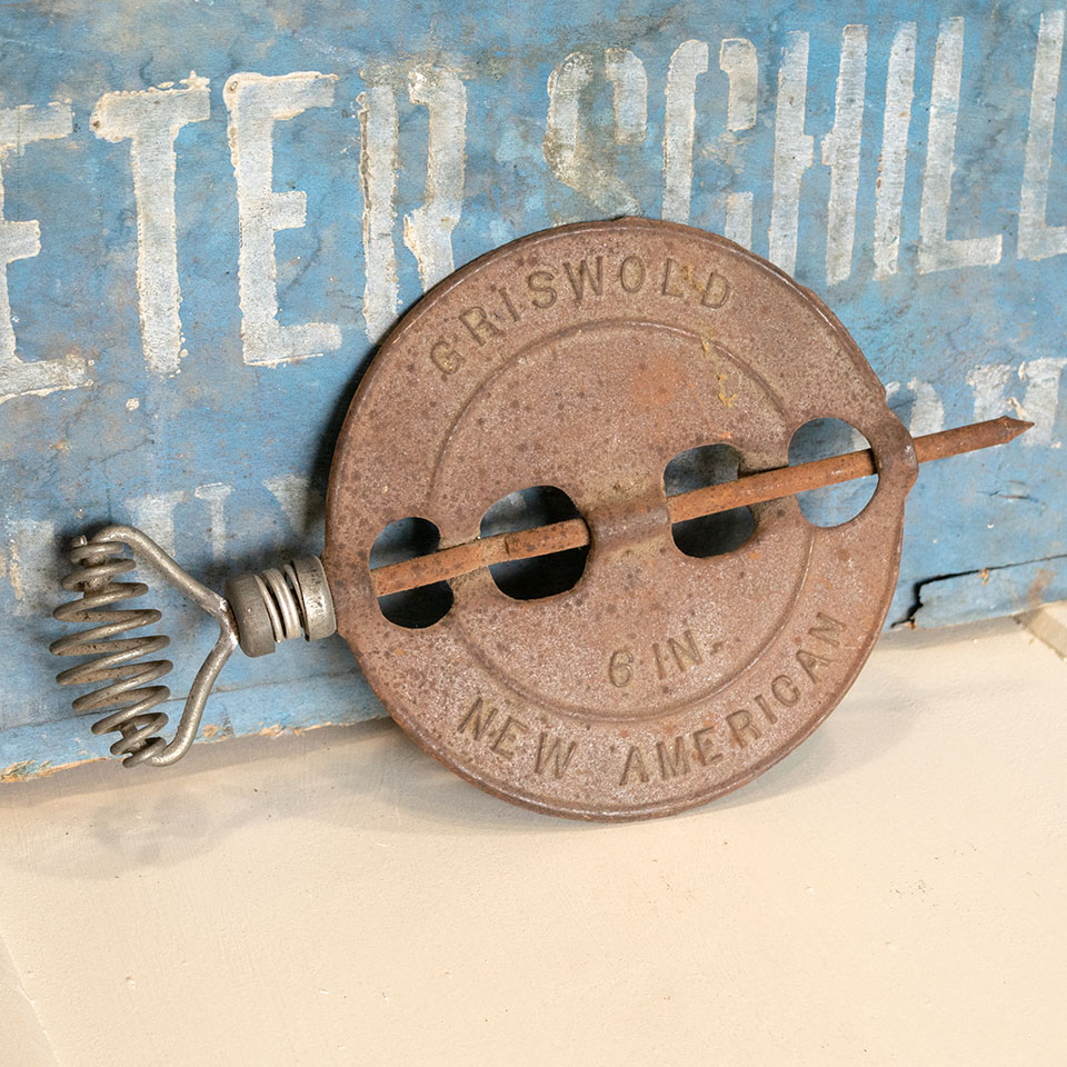 Vintage antique architectural salvage Griswold New American 6" inch reversible steel spindle stove pipe flue damper measuring approximately 6" x 9 1/2" overall.