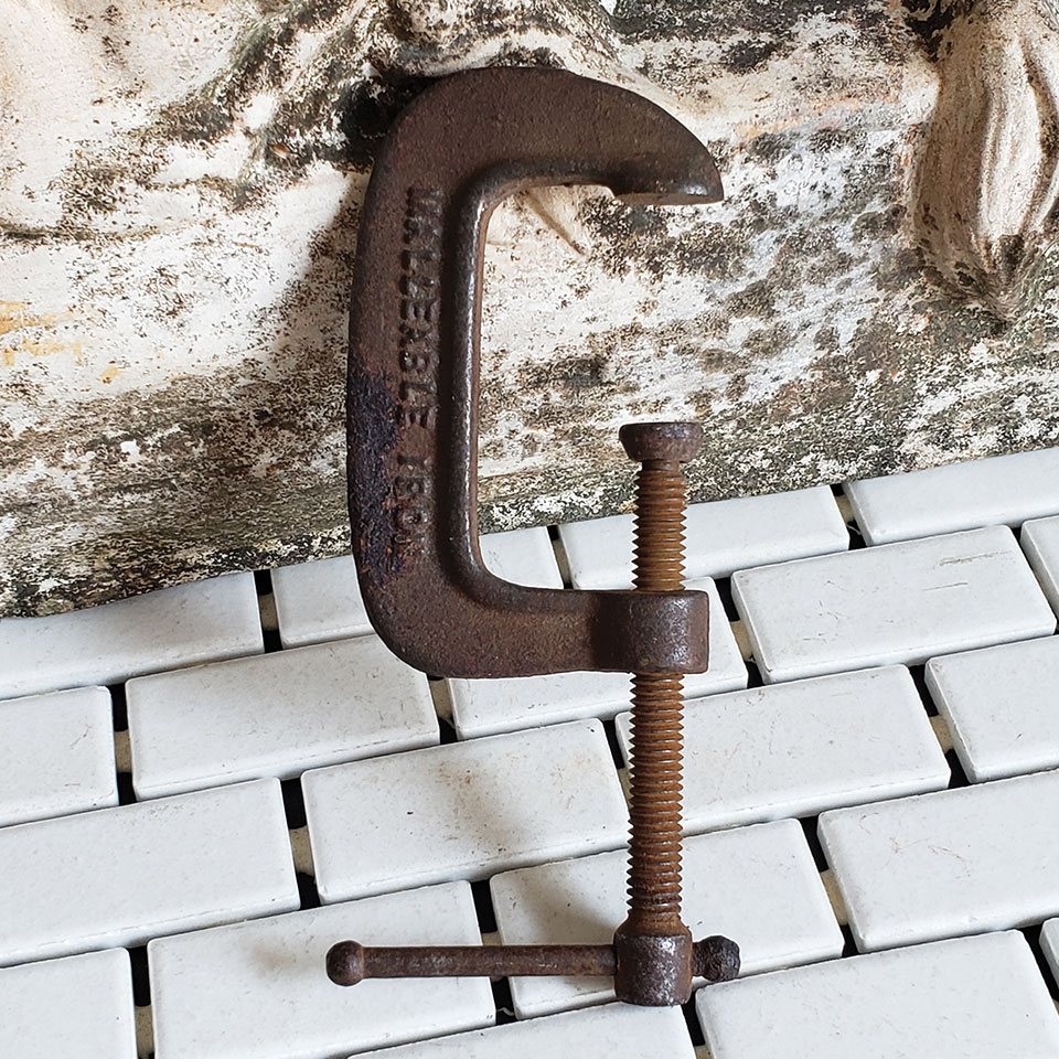 Vintage malleable iron c-clamp measuring 3 3/8" x 2" overall with a 1 7/8" maximum opening.