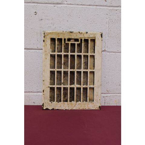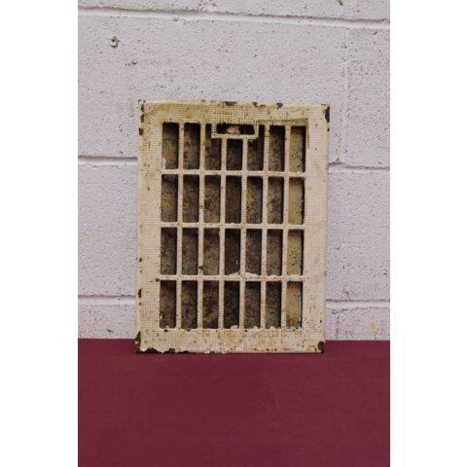 Vintage/antique architectural salvage cast iron heat grate with operable louvers measuring approximately 9" x 12" (insert dimensions) and 10 1/2" x 14" (overall dimensions).