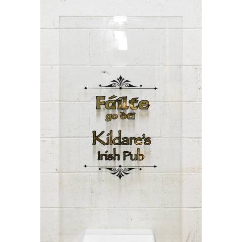 Architectural salvage glass window pane from Kildare's Irish Pub with gold lettering measuring approximately 26 3/4" wide x 47 3/4" tall. Lettering translates to "Welcome to Kildare's Irish Pub".