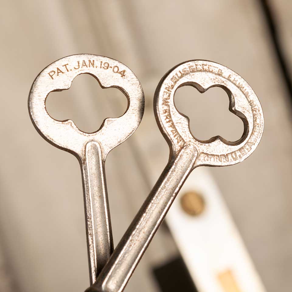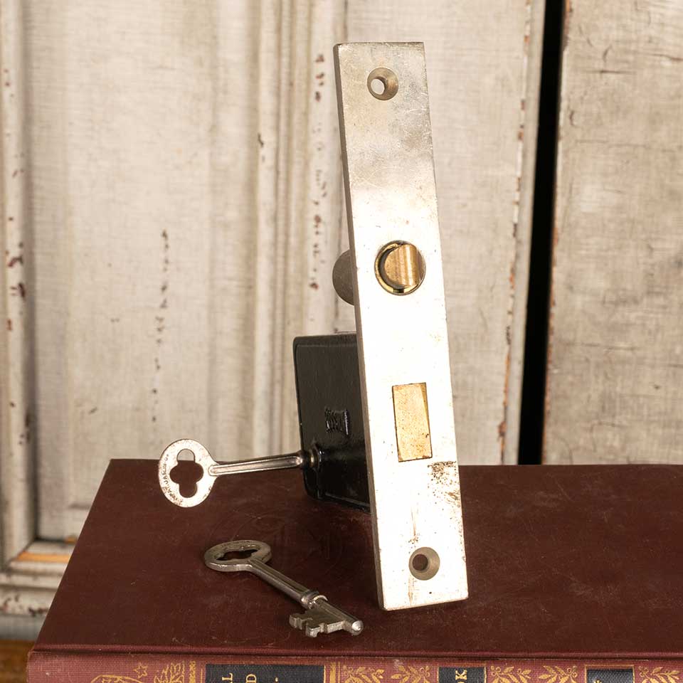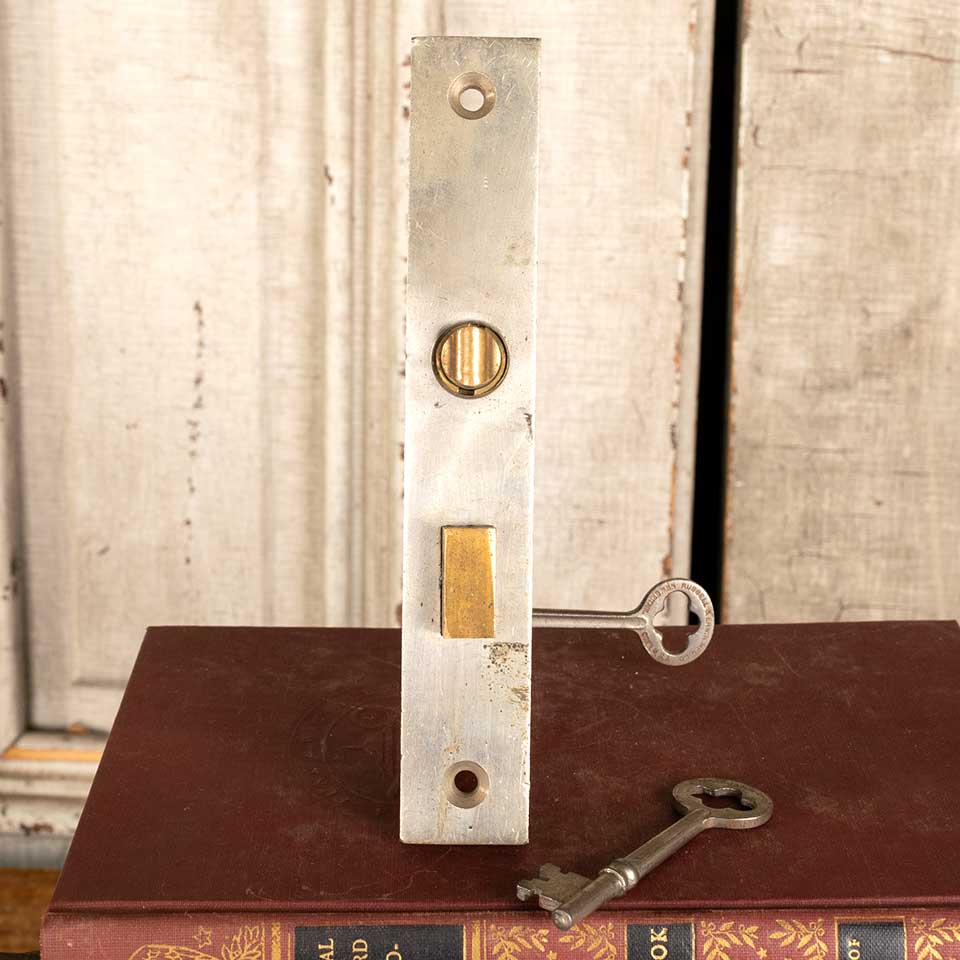 Unusual new old stock antique Russwin ball catch door mortise lock hardware with two original skeleton keys. The face plate measures approx. 1 1/8" wide x 6 3/4" tall x 1/4" thick and the mortise lock box measures approx. 3/4" thick x 3 1/2" tall 3 1/4" front to back with a 2 7/8" backset. This lock does not accommodate a doorknob set. See photos to evaluate condition. Priced at $100 for the lock and keys.