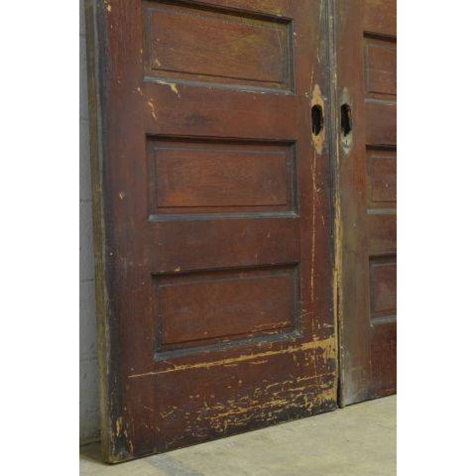 Pair of vintage antique architectural salvage six panel oak pocket doors together measuring approximately 61 1/2" wide x 90 1/4" tall x 1 3/4" thick. Priced at $650 for the pair.