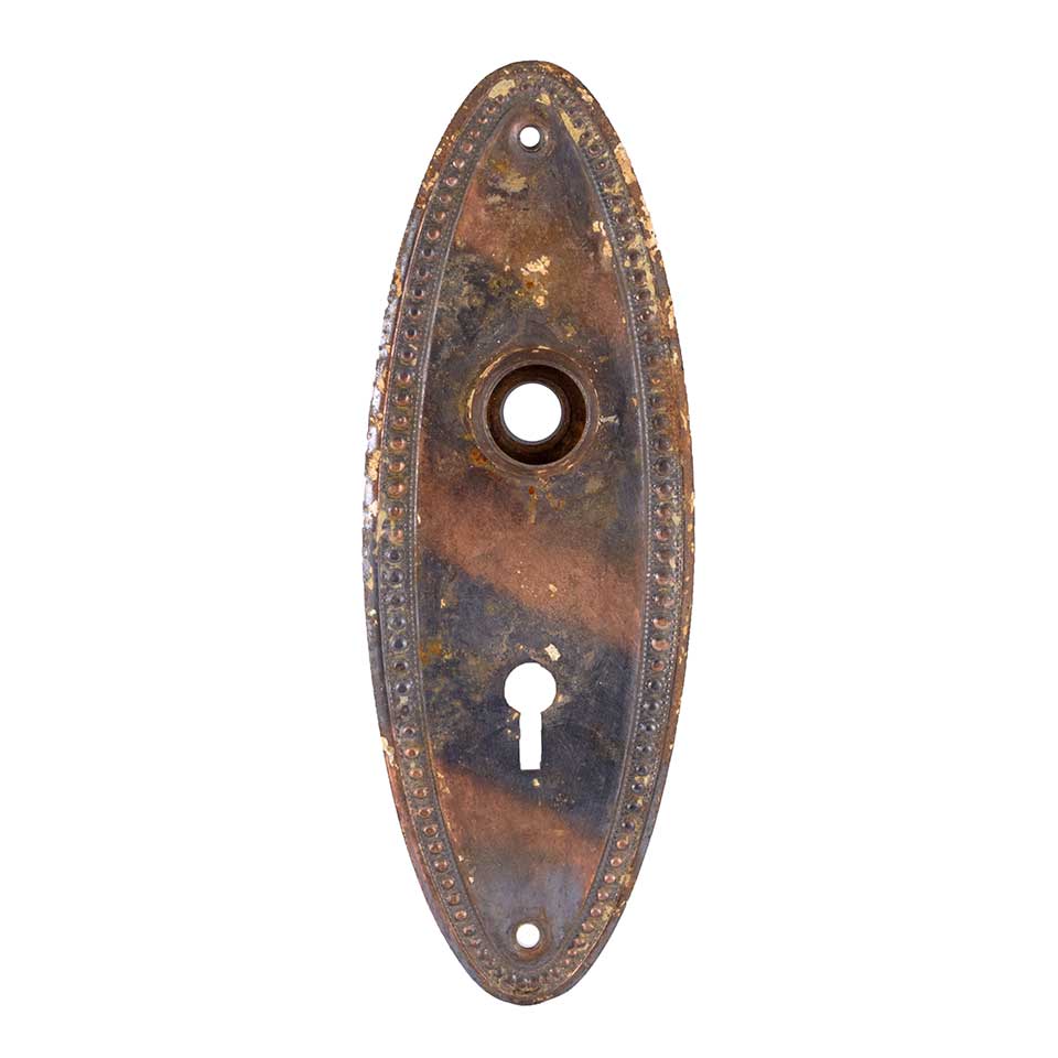 Antique architectural salvage oval Japanned pressed metal doorknob backplate hardware with beaded border and skeleton keyhole measuring approximately 2 1/2" wide x 7" tall. Distance between spindle collar and keyhole measures 2 1/2" on centers. Color and condition vary. Priced individually. Priced at $20/each.