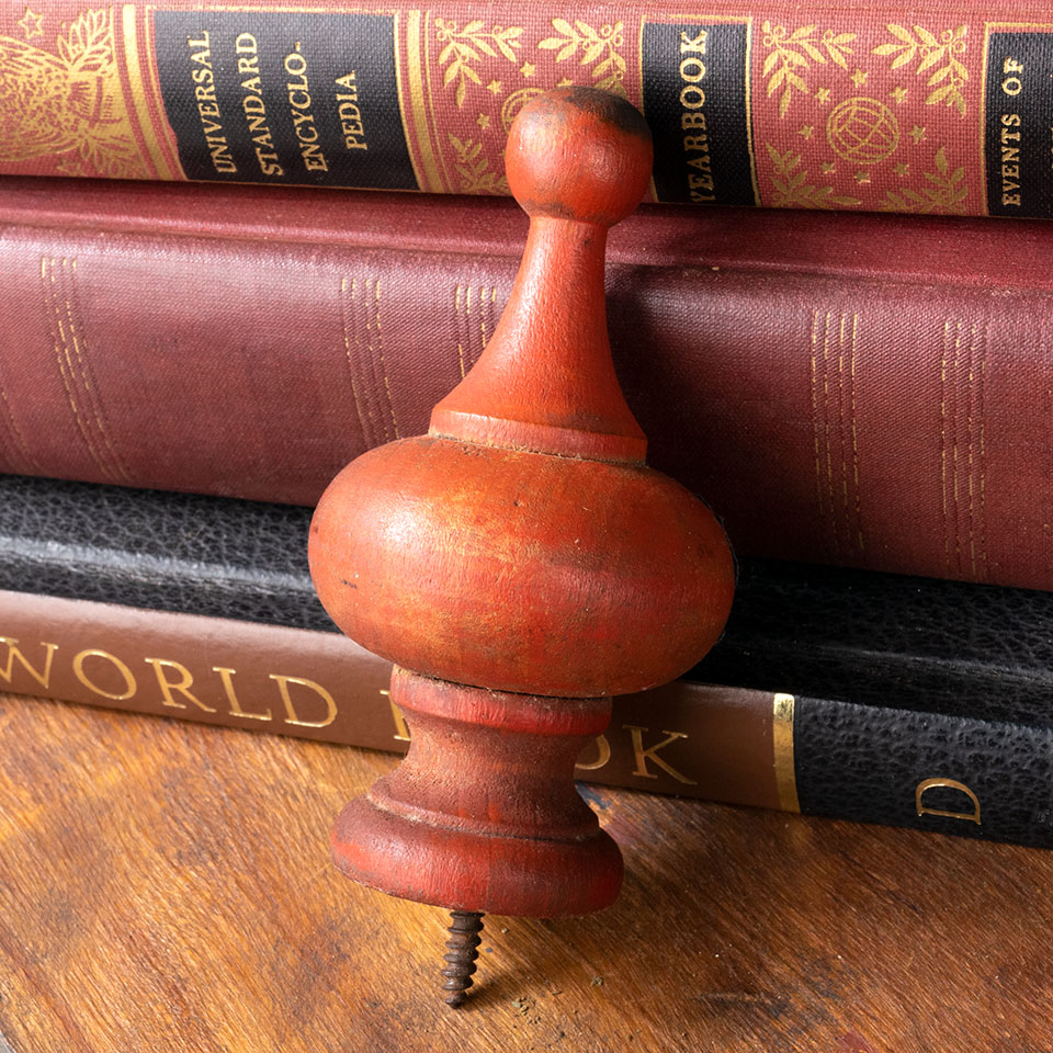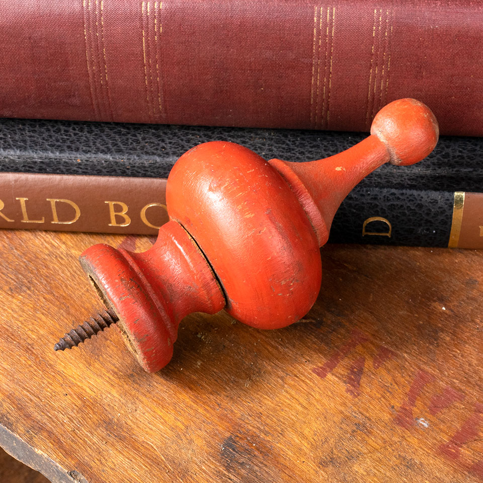 Vintage antique architectural salvage red painted turned wood finial measuring approximately 4" tall x 2" in diameter with a 5/8" long threaded screw. Sold individually. Priced at $20/each. Condition may vary.