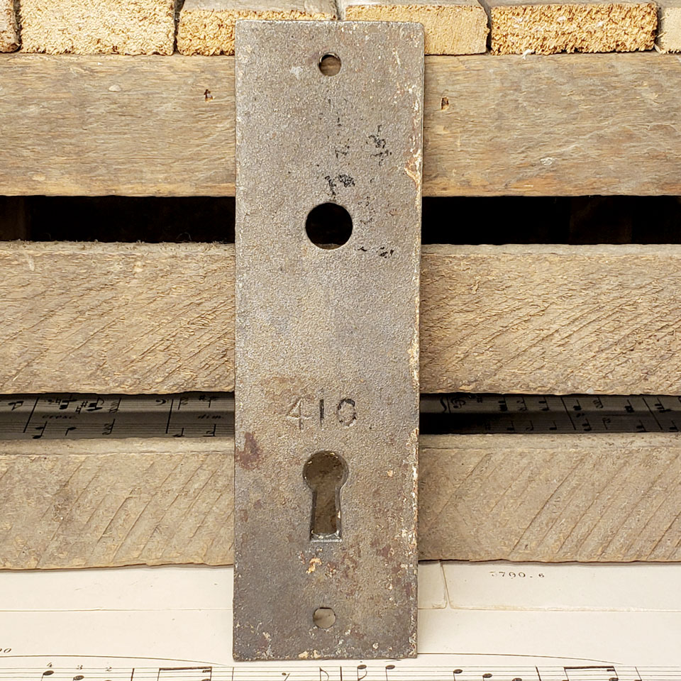 Antique architectural salvage cast iron Russell & Erwin Avallon pattern doorknob backplate c.1899 (approx. 1 5/8" wide x 5 5/8" tall with a 3/4" diameter collar). The spindle and keyhole measure 2 1/2" on center. Color and condition vary, see photos to evaluate. Priced at $28/ each.