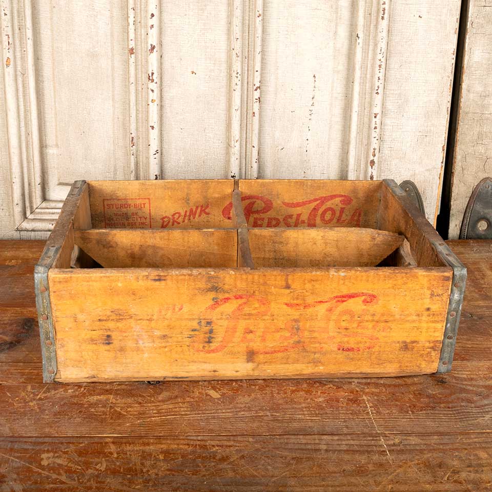 Antique PEPSI-COLA wood bottle crate with four compartments measuring approx. 12" x 18 1/2" x 5 1/2" tall. See photos to evaluate condition.