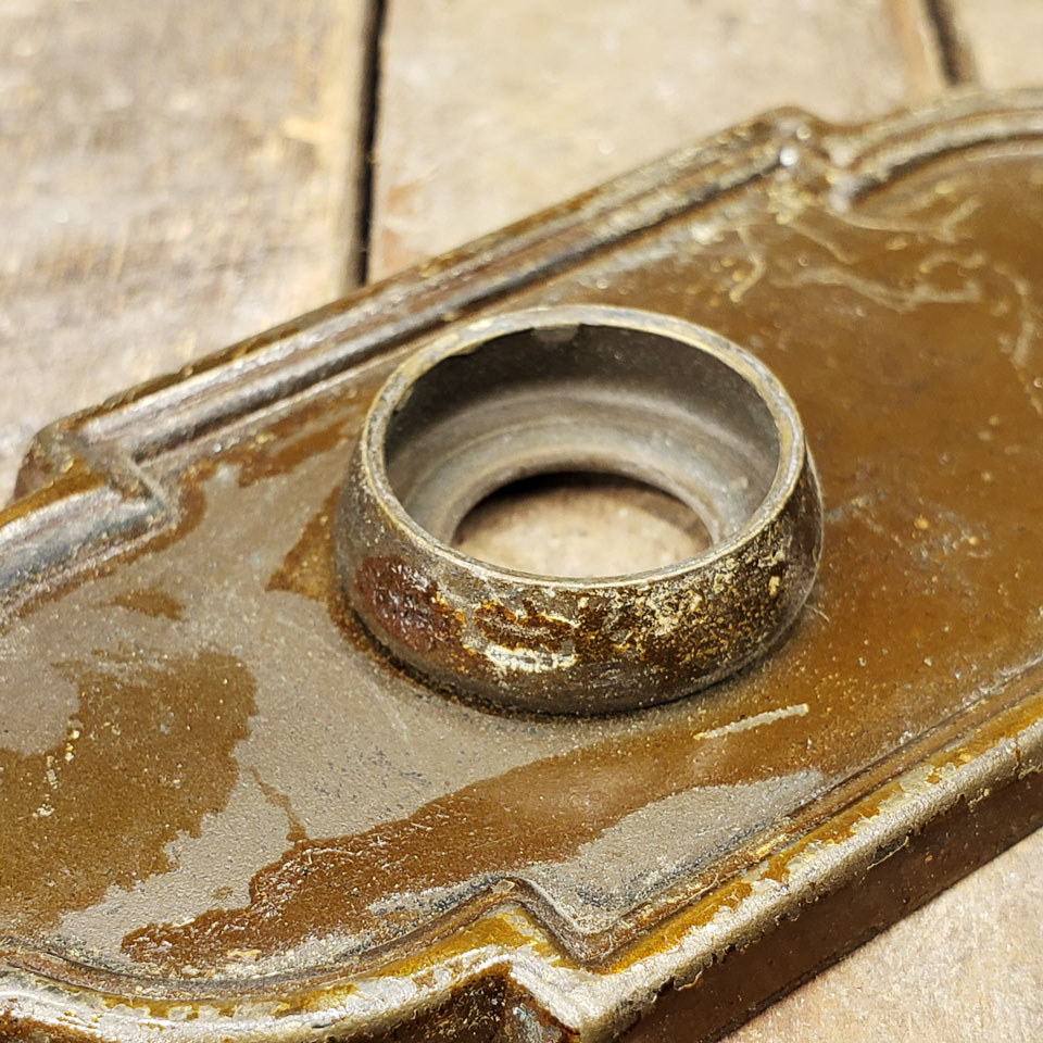 Antique architectural salvage interior doorknob backplate measuring approximately 1 7/8" wide x 6" tall x 3/8" front to back. Sold individually. Priced at $15/each. Condition may vary.