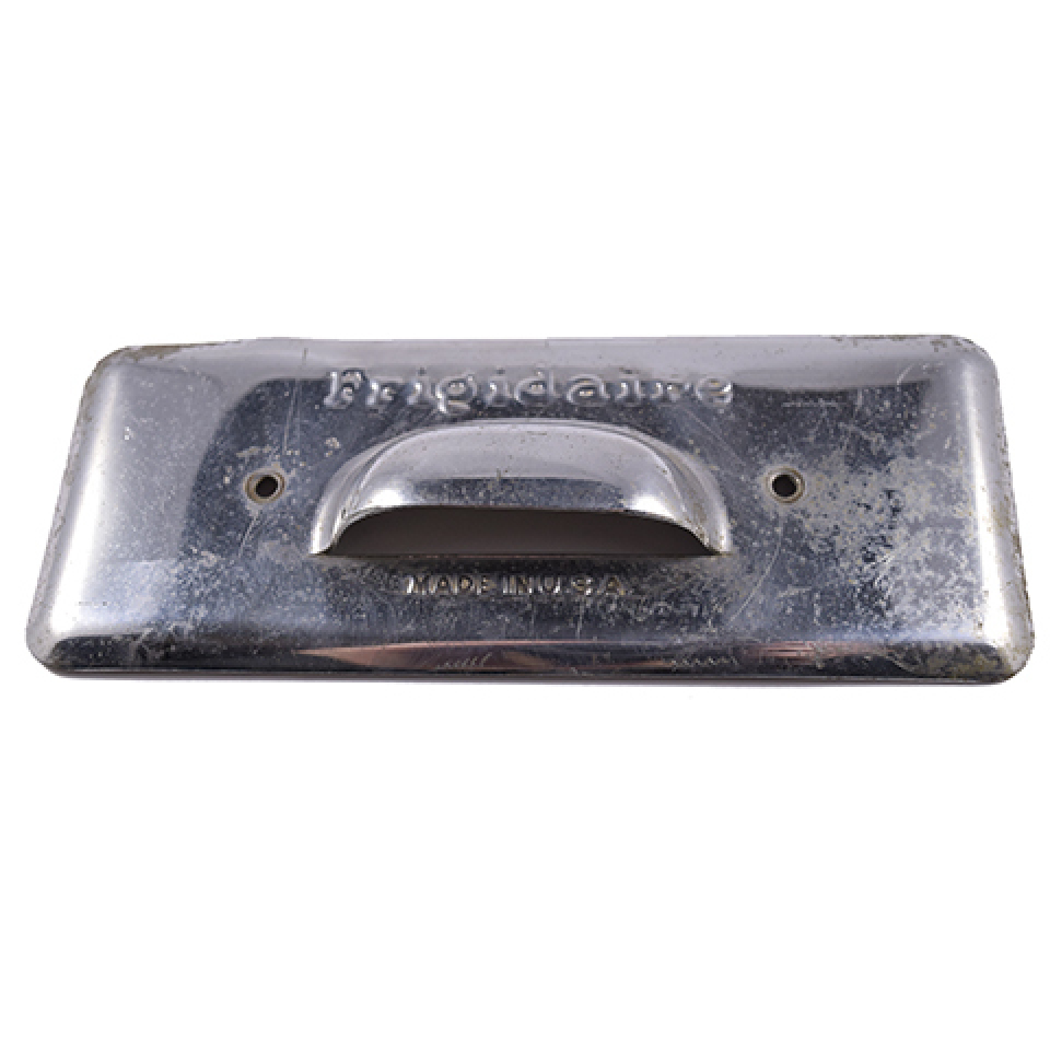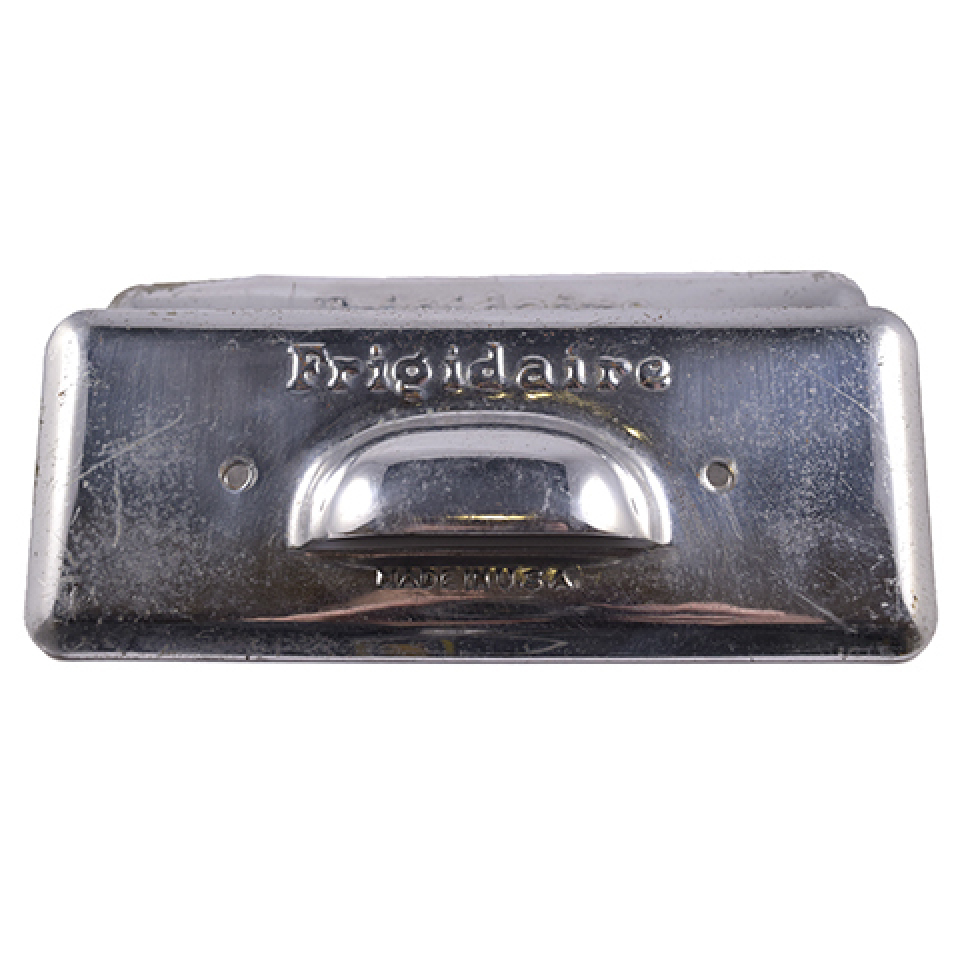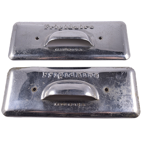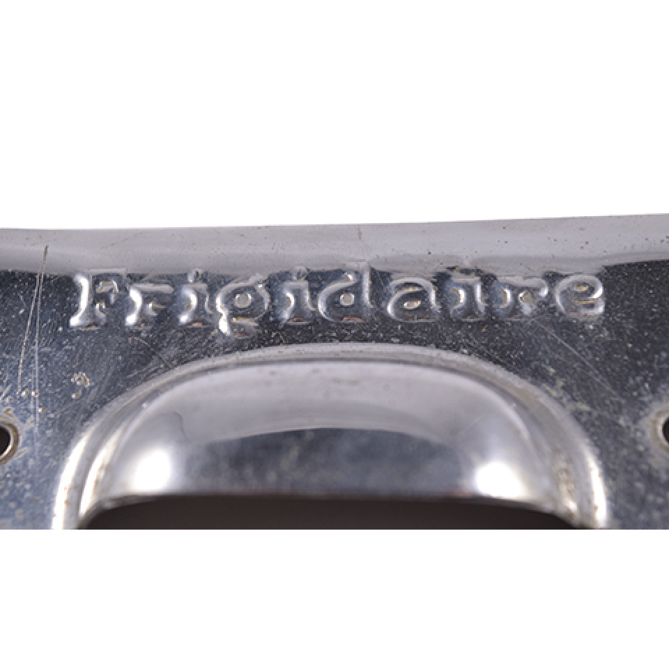 Nice pair of vintage/antique architectural salvage chrome Frigidaire pulls each measuring approximately 6 1/8" wide x 2 1/2" tall with a 1" projection. Priced at $75 for the pair.