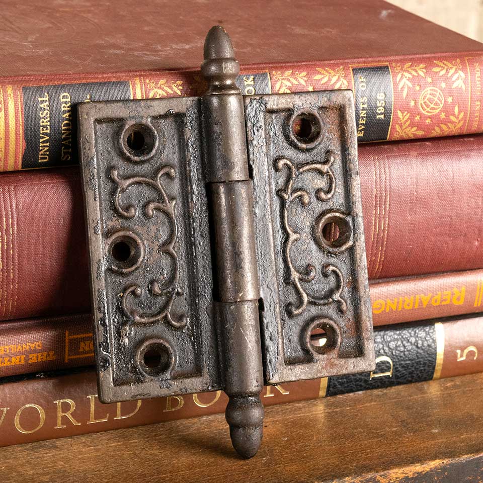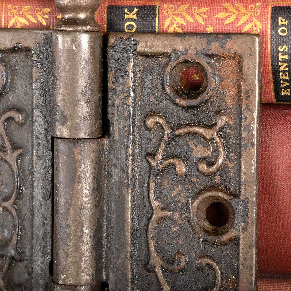 Architectural salvage antique ornate cast iron acorn finial door hinge hardware measuring approx. 3 1/2" squared (5" tall including finials). Color and condition vary, see photos to evaluate. Priced at $35/each.