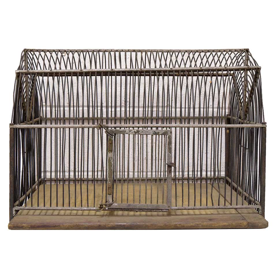 Great looking vintage/antique primitive metal wire animal cage with wood bottom measuring approximately 23 1/8" long x 16 1/2" tall x 18 1/2" wide. This would make a great display piece. There is a break in the bottom metal piece below the door (see photo).