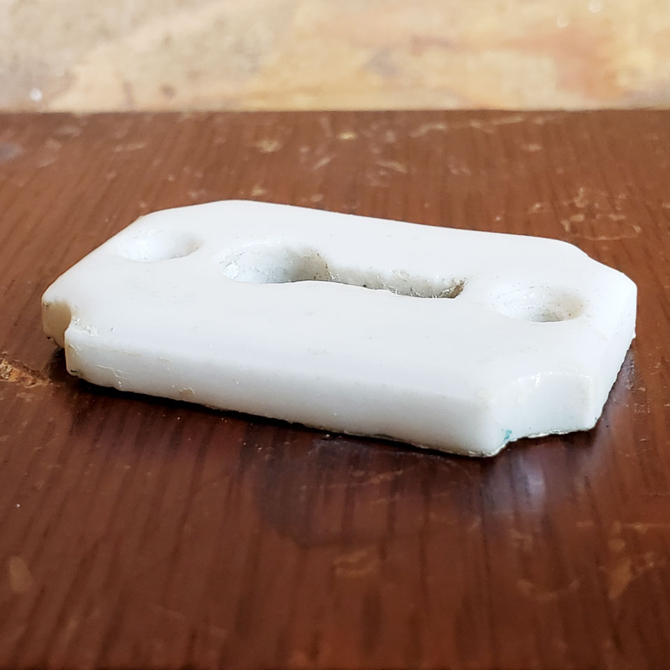 Antique architectural salvage white porcelain skeleton keyhole escutcheon cover plate door hardware with inverted corners measuring approximately 1 1/8" wide x 1 11/16" tall and screw holes measure 1 1/4" on center. Sold individually. Priced at $20/each. Due to the nature of antique salvage - condition may vary.