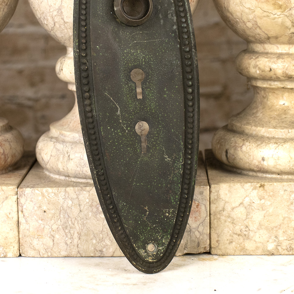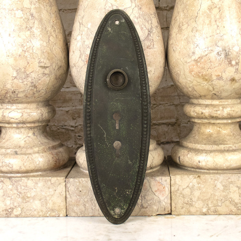 Antique architectural salvage oval brass entry door backplate hardware with double keyholes and beaded boarder measuring approximately 3 1/8" wide x 10" tall with a 5/8" diameter collar. Condition consistent with age and use (See photos). Priced at $35/each. Due to the nature of salvaged hardware - condition and patina may vary.