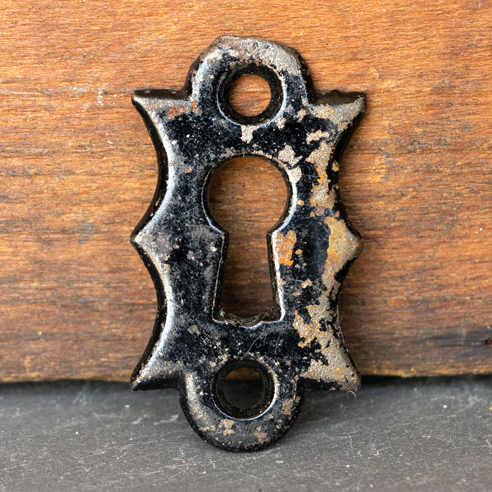 Antique architectural salvage cast iron skeleton keyhole escutcheon cover plate door hardware measuring approximately 1 1/8" wide x 1 7/8" tall. Sold individually. Priced at $10/each. Condition may vary.