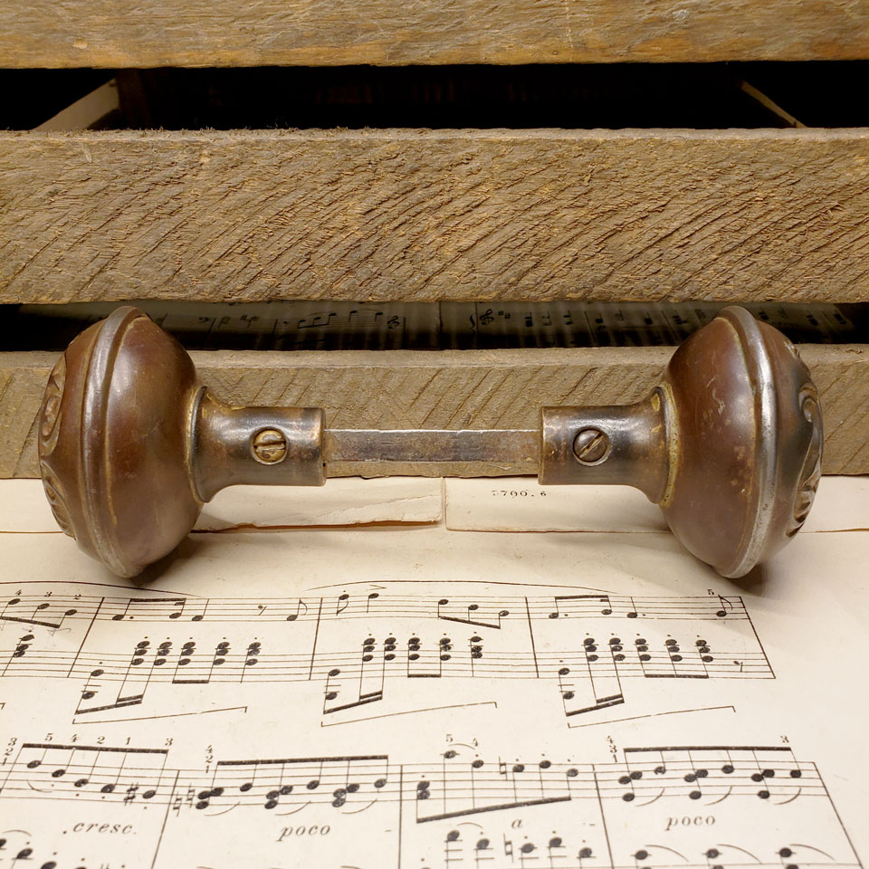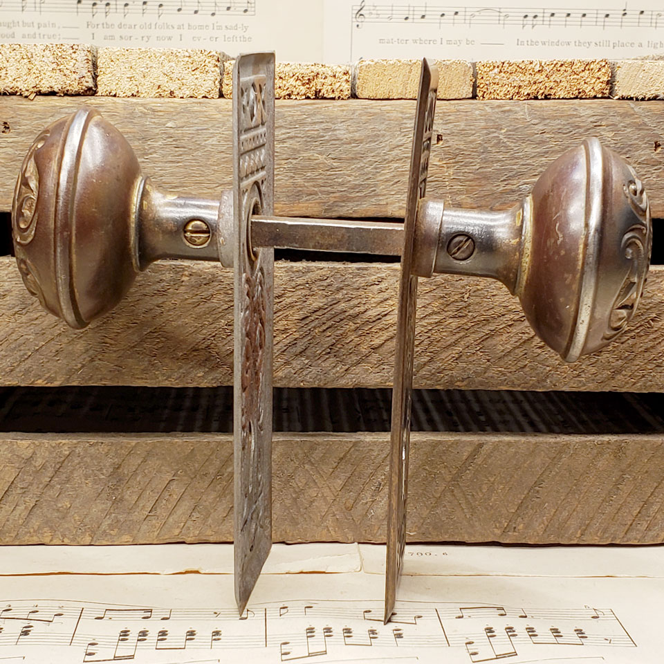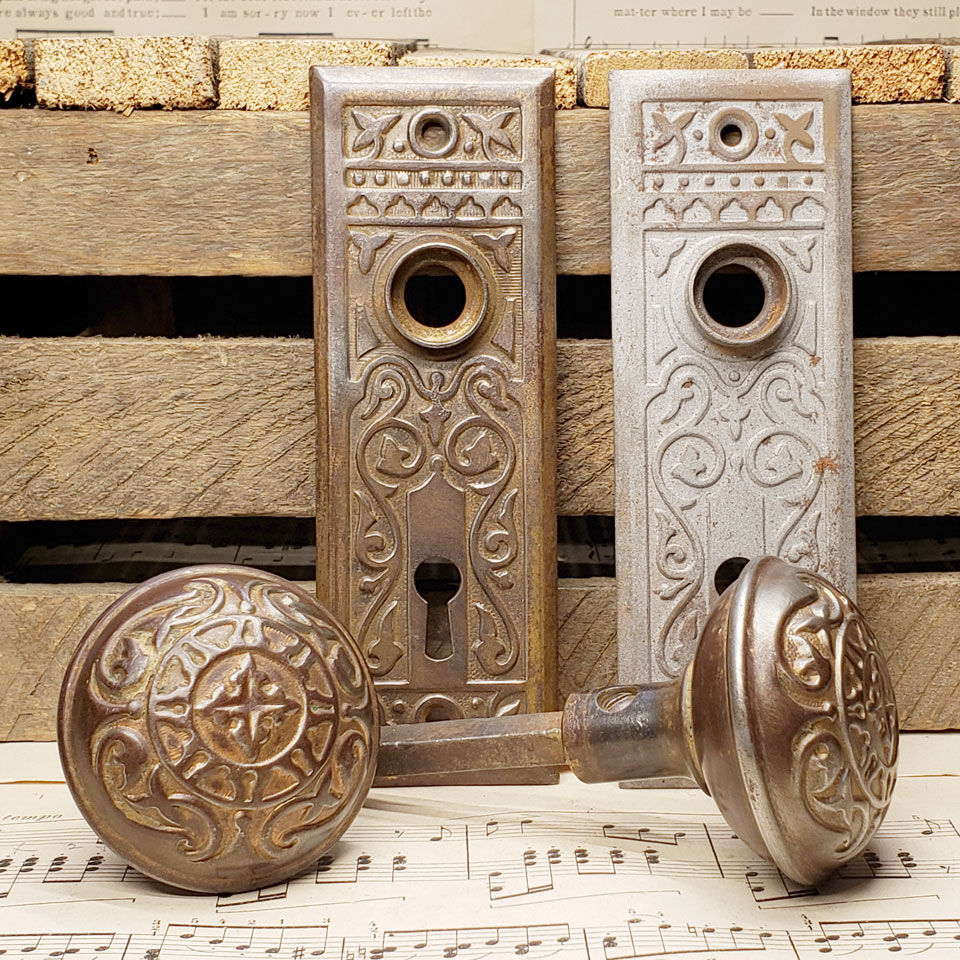 Antique architectural salvage wrought steel Penn Hardware Magnolia pattern interior door hardware set circa 1907 including a pair of 2 1/4" diameter knobs with tapped spindle and set screws and a pair of 1 7/8" x 5 1/2" backplates with skeleton keyholes. One backplate was sandblasted. Sold as a set. Priced at $125 for the set.