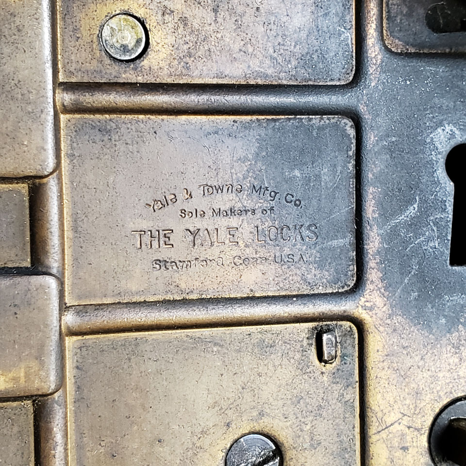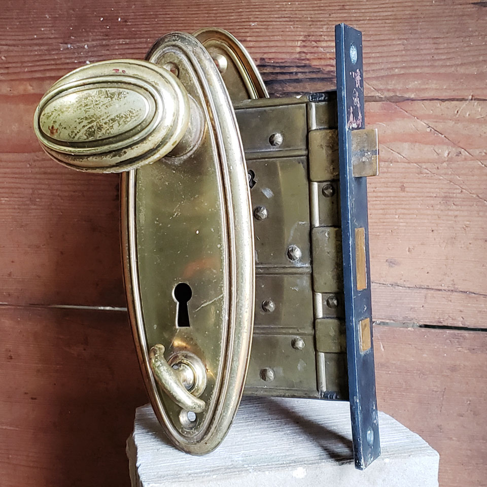 Antique architectural salvage circa late 1800's Yale & Towne solid brass entry door hardware set including oval doorknobs, oval backplates, and mortise latch with thumb turn bolt. No skeleton key. Each knob measures approximately 1 11/16" x 2 11/16" and each backplate measures 2 9/16" x 7 1/16". The mortise measures 1" x 7" front and 5/8" x 5" x 3 1/4" back. Set also includes Vulcan mortise deadbolt latch with thumb turn measuring 7/8" x 4" front and 5/8" x 2 1/4" x 3 1/4" back. Priced at $350 for the set AS FOUND. Repairs to damaged knob needed prior to use. Contact Us for more info.