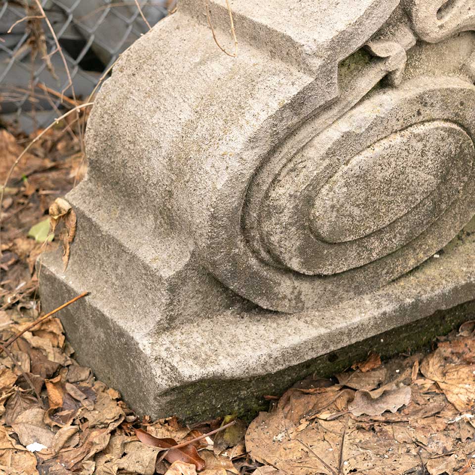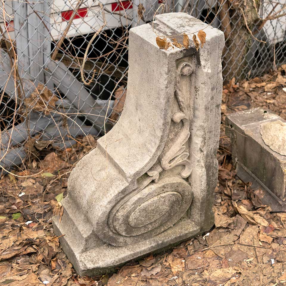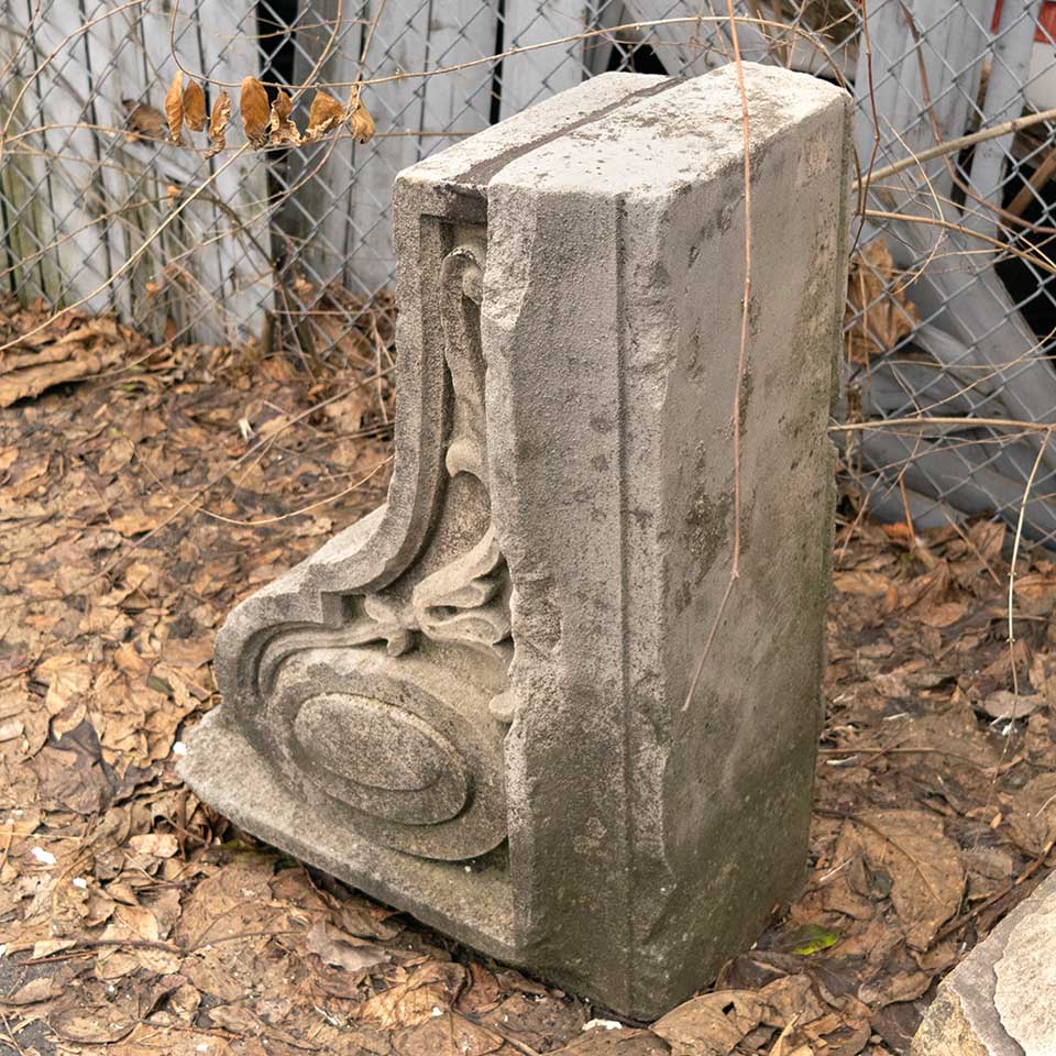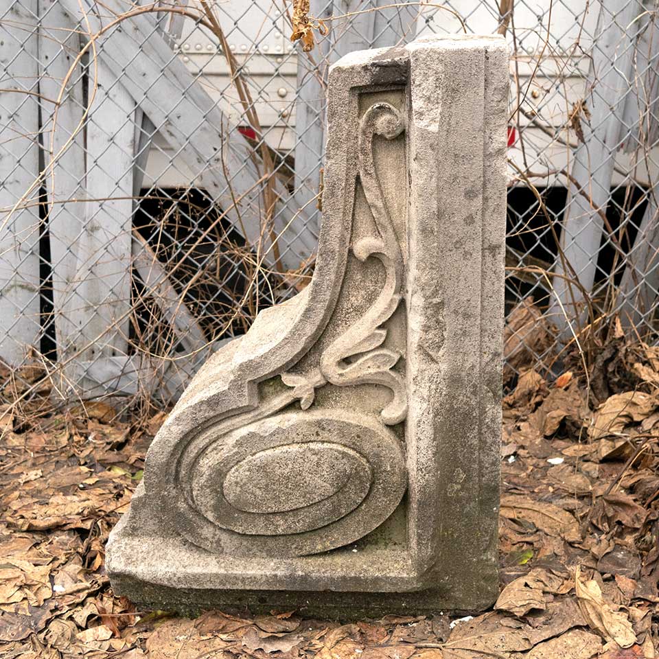 Architectural salvage antique carved stone building bracket/corbel ornament measuring approx. 12 3/4" wide x 30 3/4" tall x 21 1/2" front to back. This would be a fantastic piece to use as a garden element. See photos to evaluate condition.