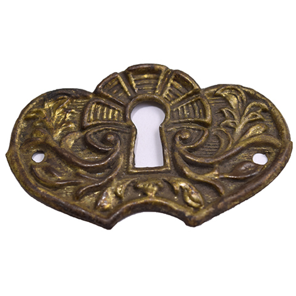 Antique architectural salvage ornate Victorian pressed brass keyhole furniture escutcheon hardware measuring approximately 2 1/8" wide x 1 1/8" tall.