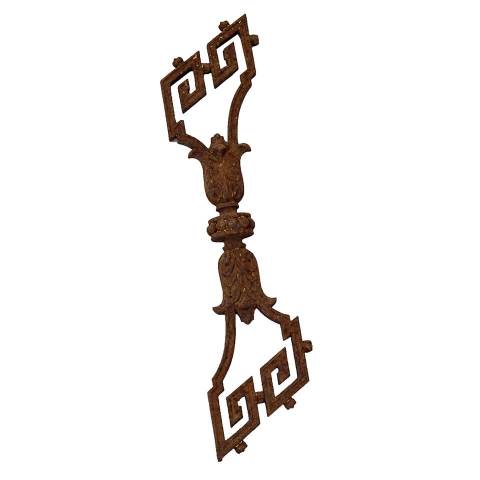 Architectural salvage antique ornate cast iron stair railing baluster measuring approx. 18" wide x 20 3/4" tall x 2 5/8" front to back. Color and condition may vary. Priced at $95/each.