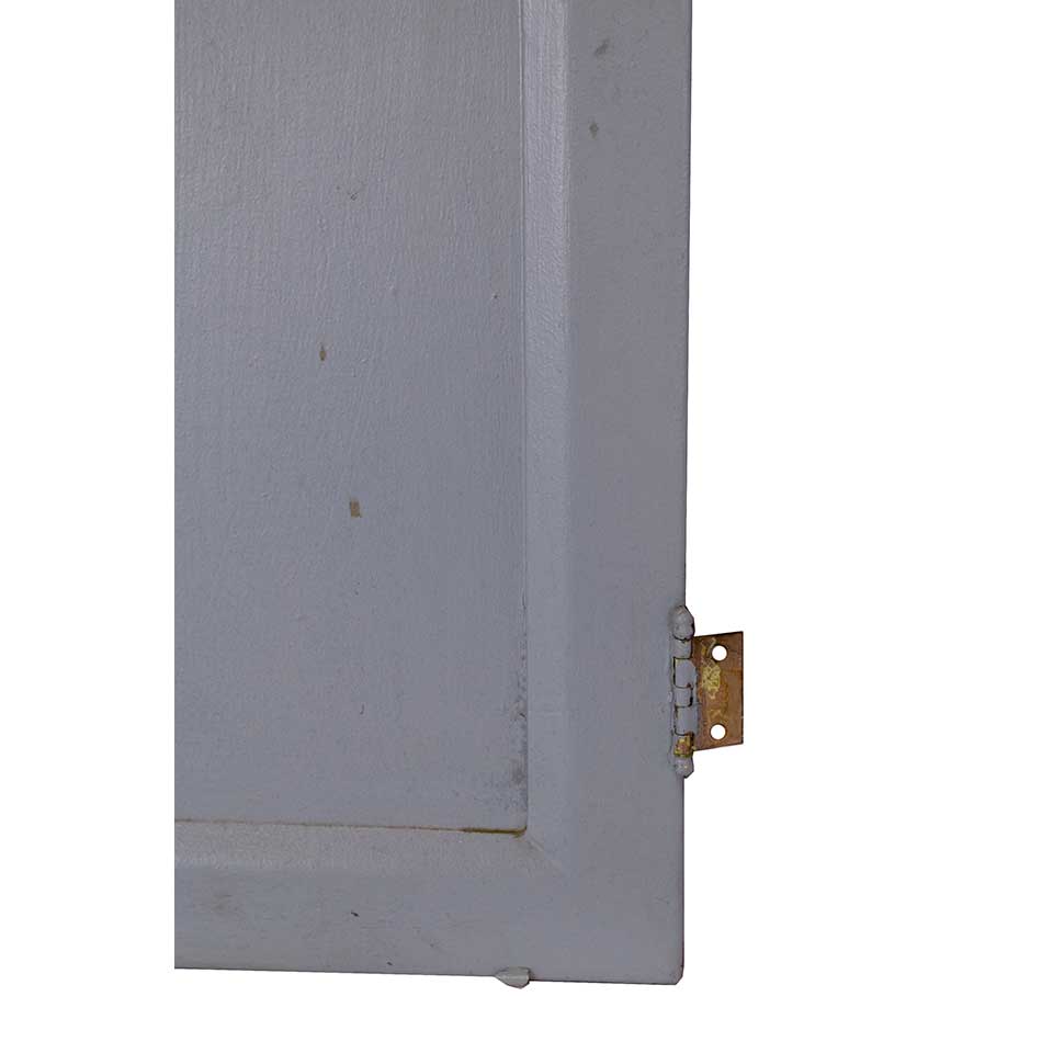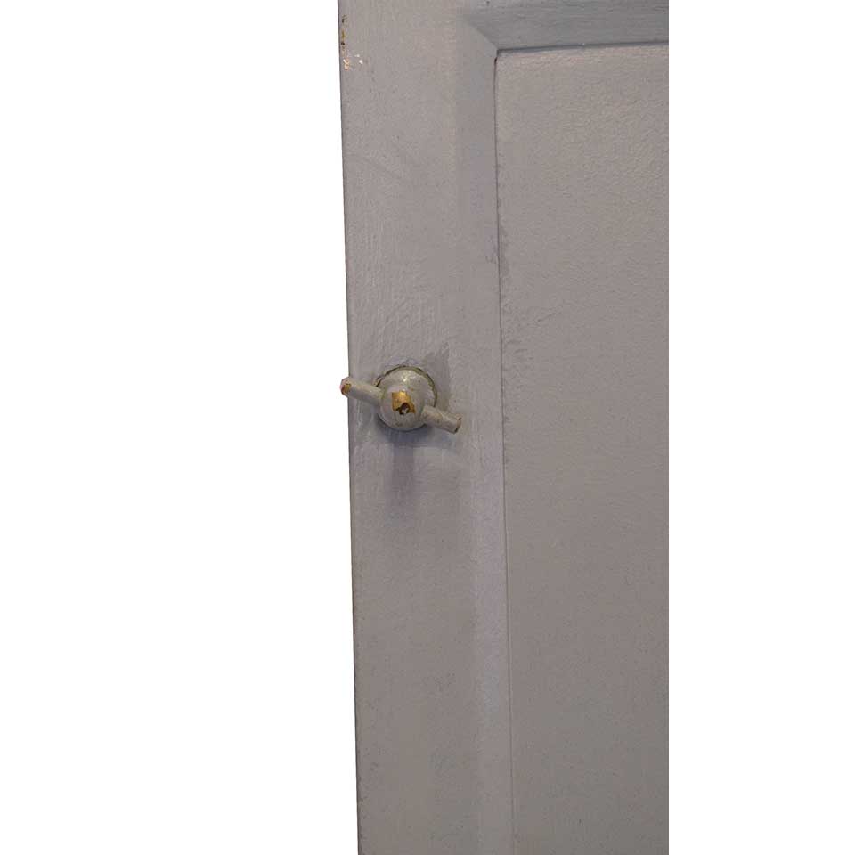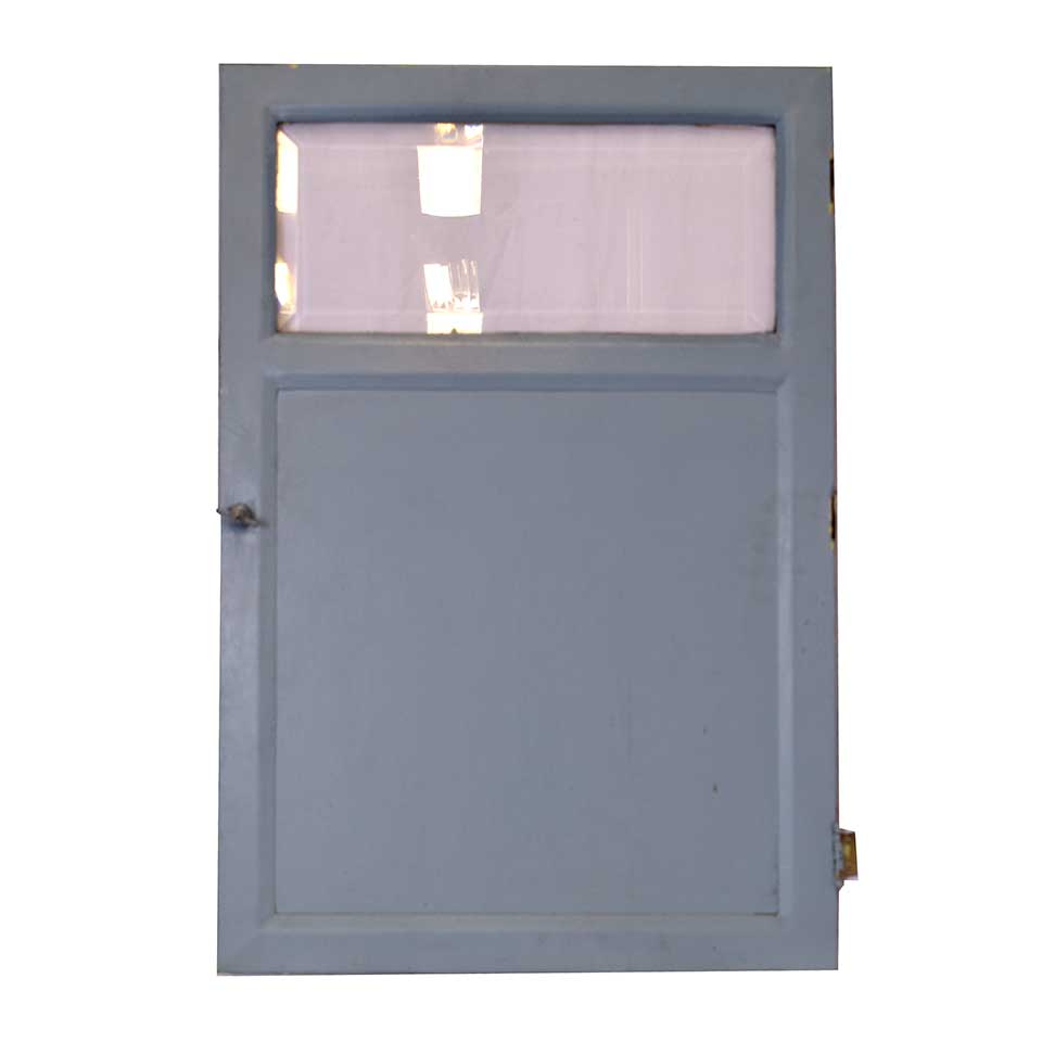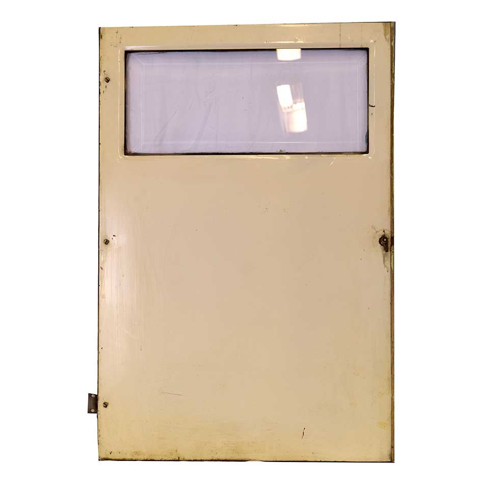 Small vintage/antique architectural salvage metal door with beveled glass lite measuring approximately 21 1/4" wide x 31 3/8" tall x 5/8" thick.