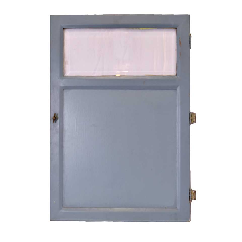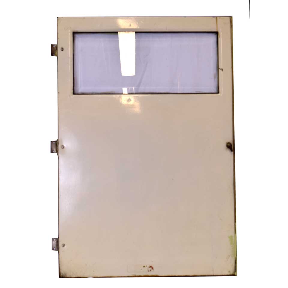 Small vintage/antique architectural salvage metal door with beveled glass lite measuring approximately 21 1/4" wide x 31 3/8" tall x 5/8" thick.