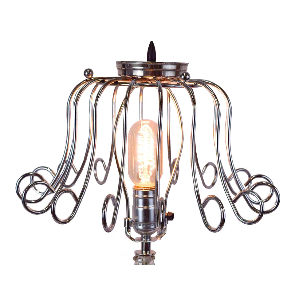 Repurposed silver plate coffee urn lamp measuring approximately 13" in diameter x 24" tall.