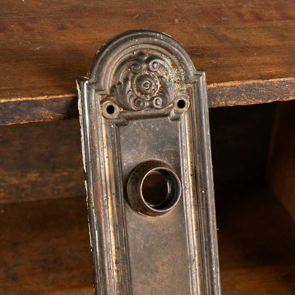 Architectural salvage antique Yale & Towne Nubian pattern c. 1920 stamped / pressed steel doorknob backplate door hardware measuring approx. 2 3/8" wide x 8" tall with a 3/4" diameter collar. Distance between spindle and keyholes is 2 3/4". Color and condition may vary, see photos to evaluate. Priced at $25/each.