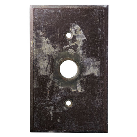 Antique architectural salvage brass single push button electric light switch cover plate hardware measuring approximately 2 3/4" wide x 4 1/2" tall x 1/8" front to back.