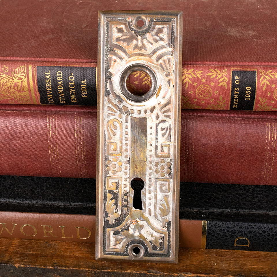 Architectural salvage antique pressed steel Corbin Canton pattern pattern (c.1895) doorknob backplate door hardware measuring approx. 1 7/8" wide x 5 1/2" tall with a 7/8" diameter collar. The spindle and keyholes measure 2 1/2" on centers. Color and condition may vary, see photos to evaluate. Priced at $18/each.