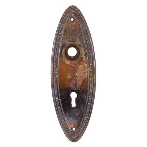 Antique architectural salvage oval Japanned pressed metal doorknob backplate hardware with beaded border and skeleton keyhole measuring approximately 2 3/8" wide x 7" tall. Distance between spindle collar and keyhole measures 2 1/2" on centers. Color and condition vary. Priced individually. Priced at $20/each.
