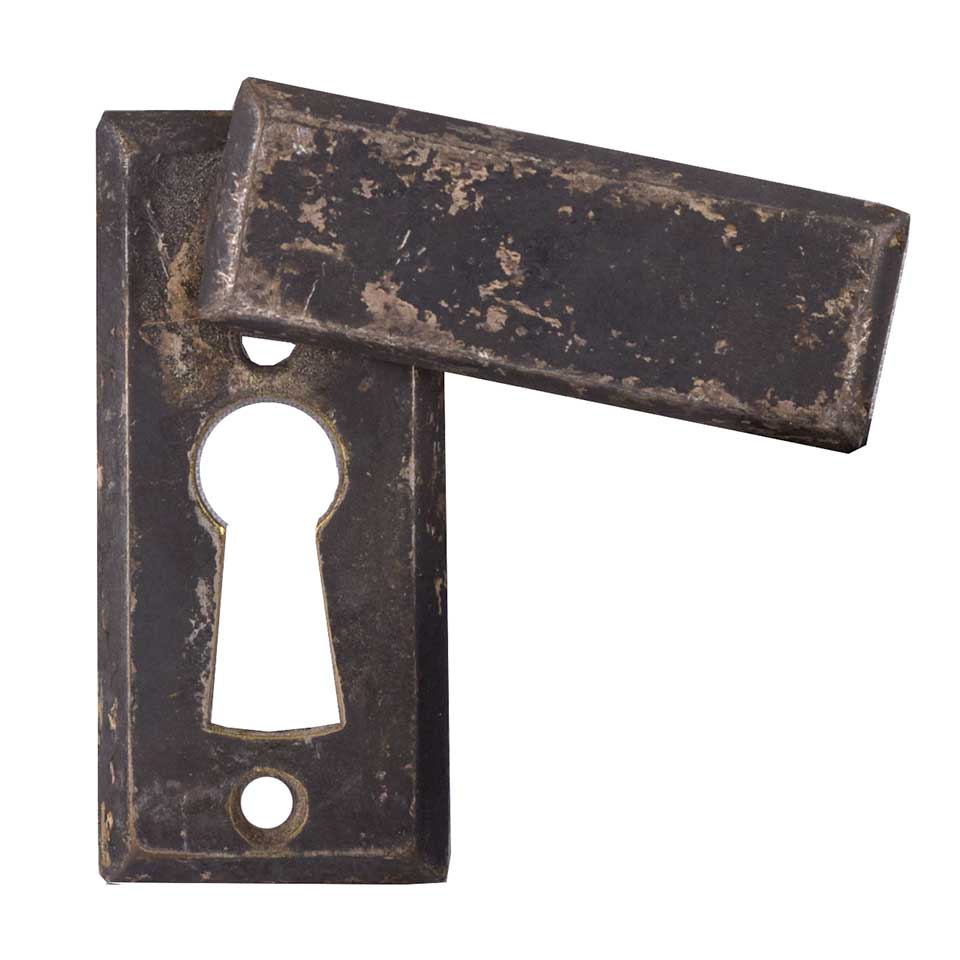 Vintage/antique architectural salvage metal keyhole door escutcheon hardware with attached keyhole cover measuring approximately 1" wide x 2 1/4" tall x 1/4" front to back. Priced at $20/each. Due to the nature of architectural salvage condition and color may vary.