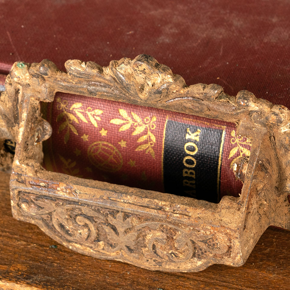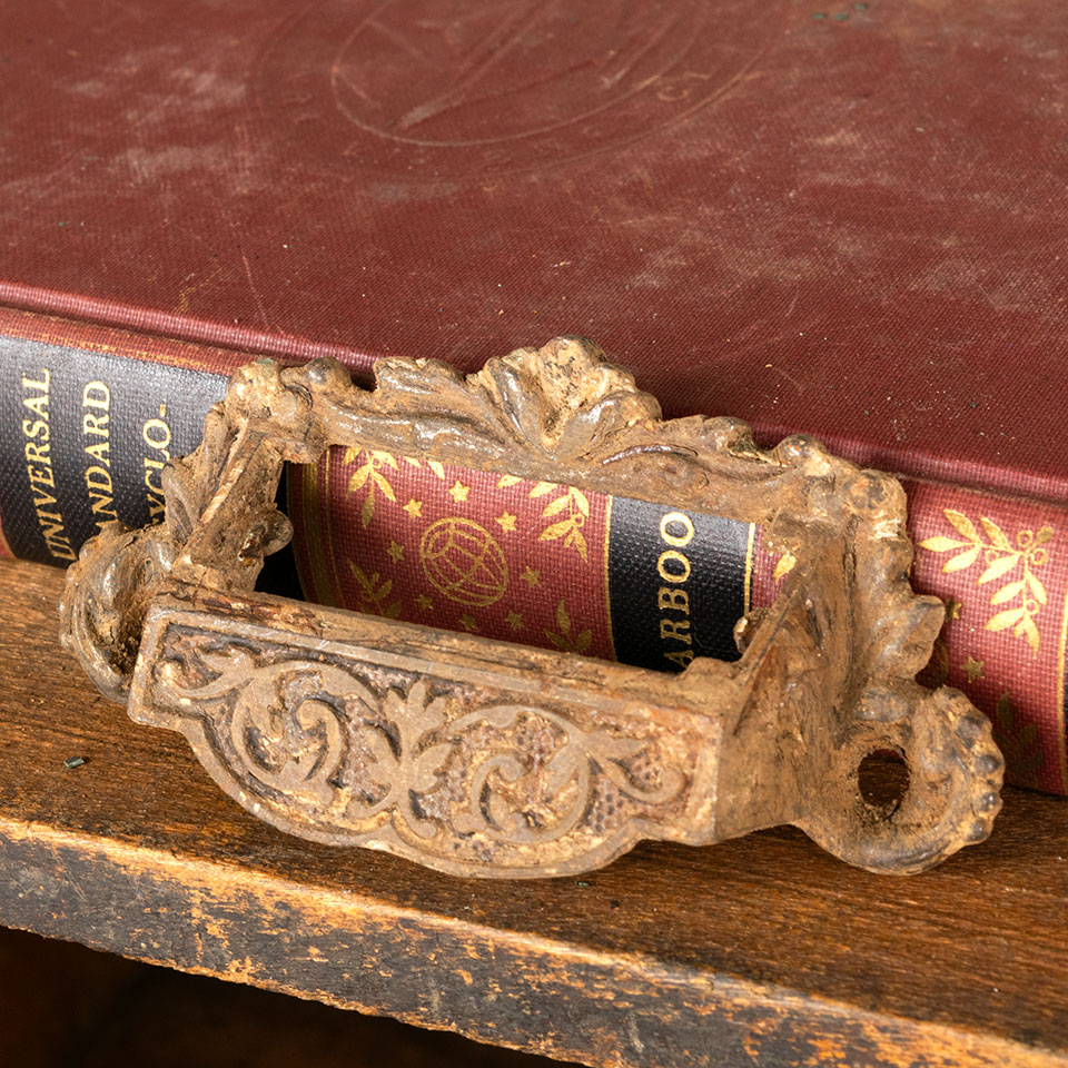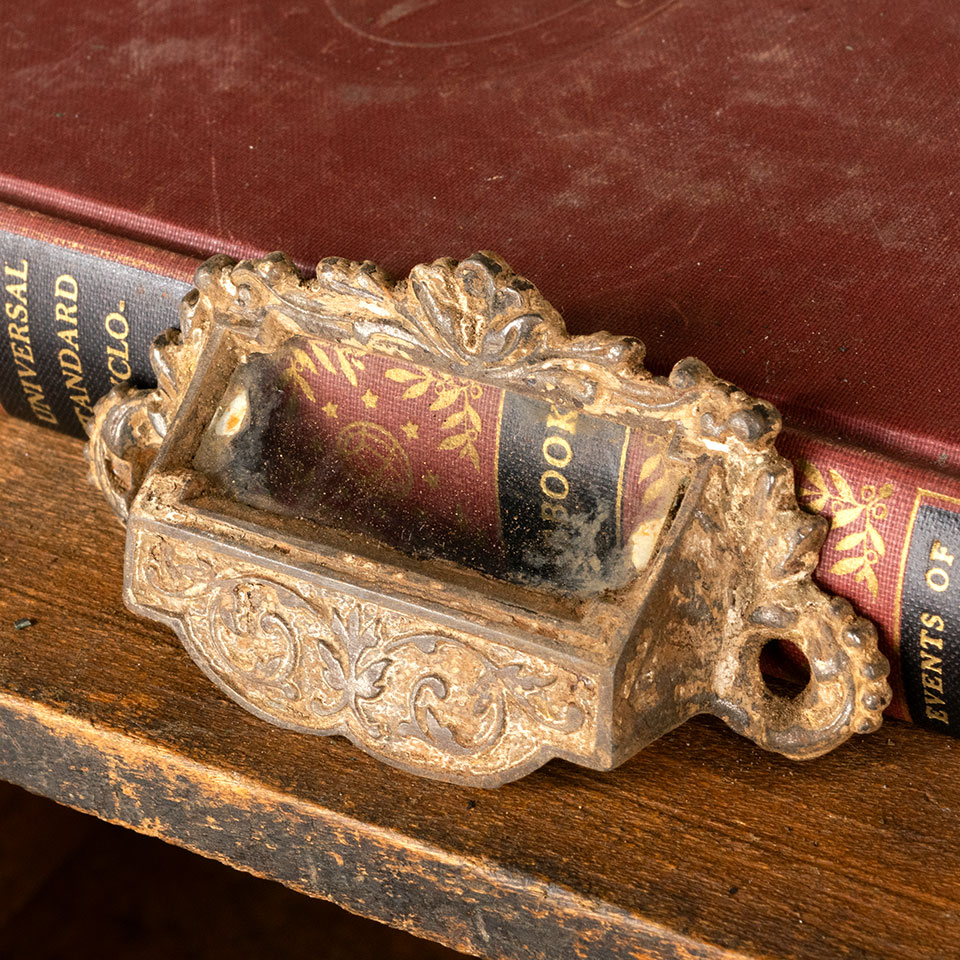 Antique architectural salvage cast iron bin drawer pull card catalog apothecary hardware measuring approx. 3 1/2" wide x 1 7/8" tall x 3/4" front to back. Screw holes measure 3" on center. Some with glass, some without. Color and condition vary, see photos to evaluate. Priced at $25/each.