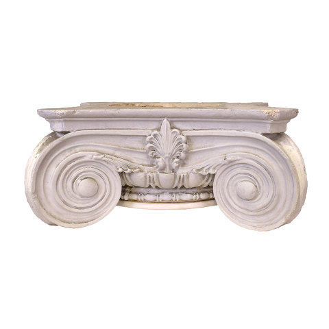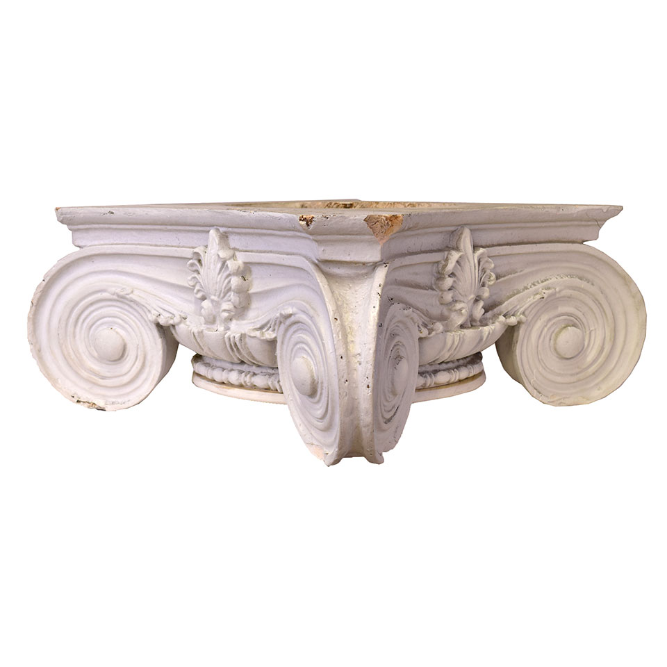 Architectural salvage vintage plaster ionic column capital measuring approx. 25 1/2" square x 8 1/4" tall. See photos to evaluate condition.